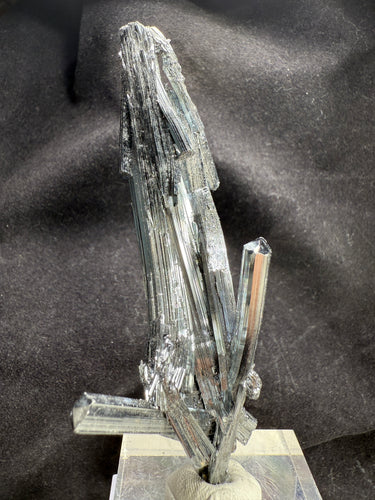 Stibnite – A striking sulfide mineral, stibnite is known for its metallic silver-gray color and brilliant metallic luster. It commonly forms long, slender, and striated prismatic crystals that can cluster into dramatic, radiating sprays. Stibnite is prized by collectors for its sharp crystal edges, reflective surfaces, and aesthetic crystal formations. Its softness and brittle nature mean it should be handled with care. Found in hydrothermal veins, stibnite often occurs alongside quartz, calcite, and other sulfide minerals.