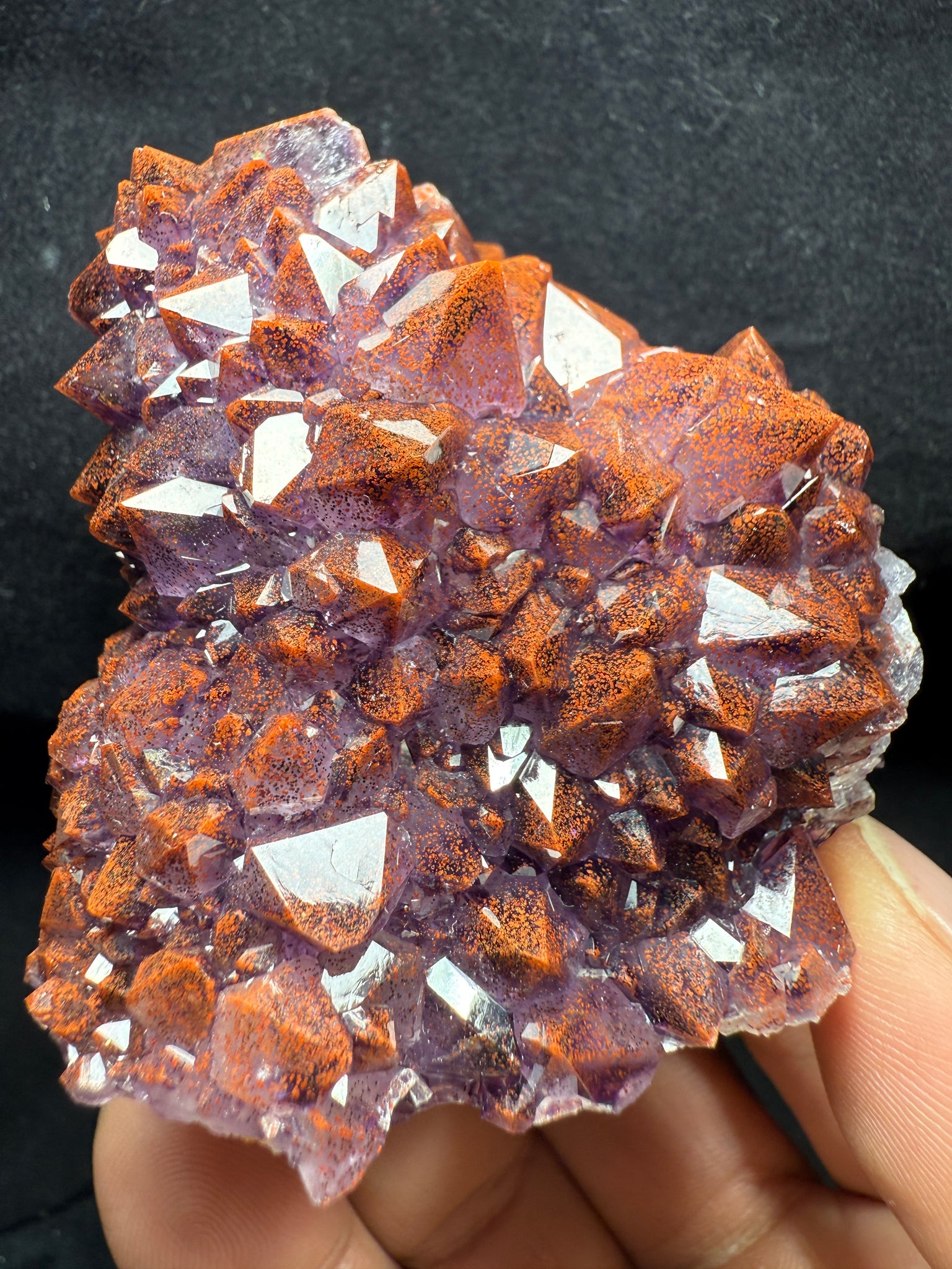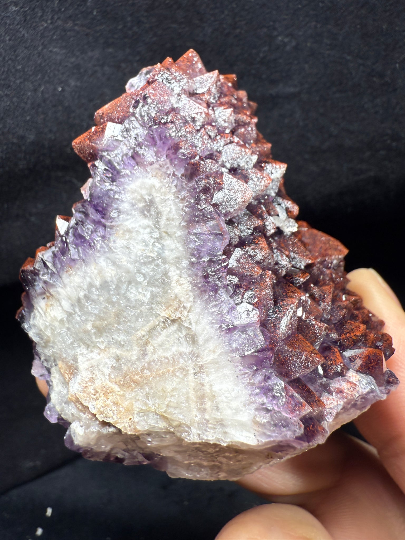 Striking Amethyst specimen displaying magnificent deep-red crystals beautifully developed on three distinct sides. The well-formed crystals and vibrant color make this a highly aesthetic and eye-catching piece. 7.0 x 6.0 x 5.0 cm.