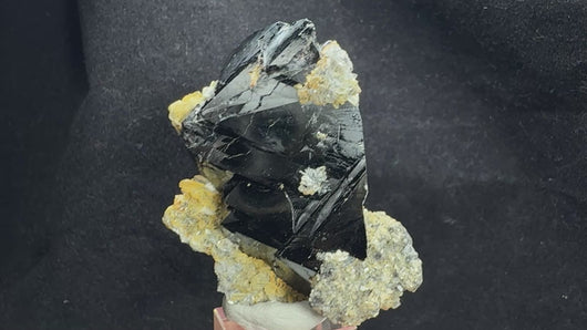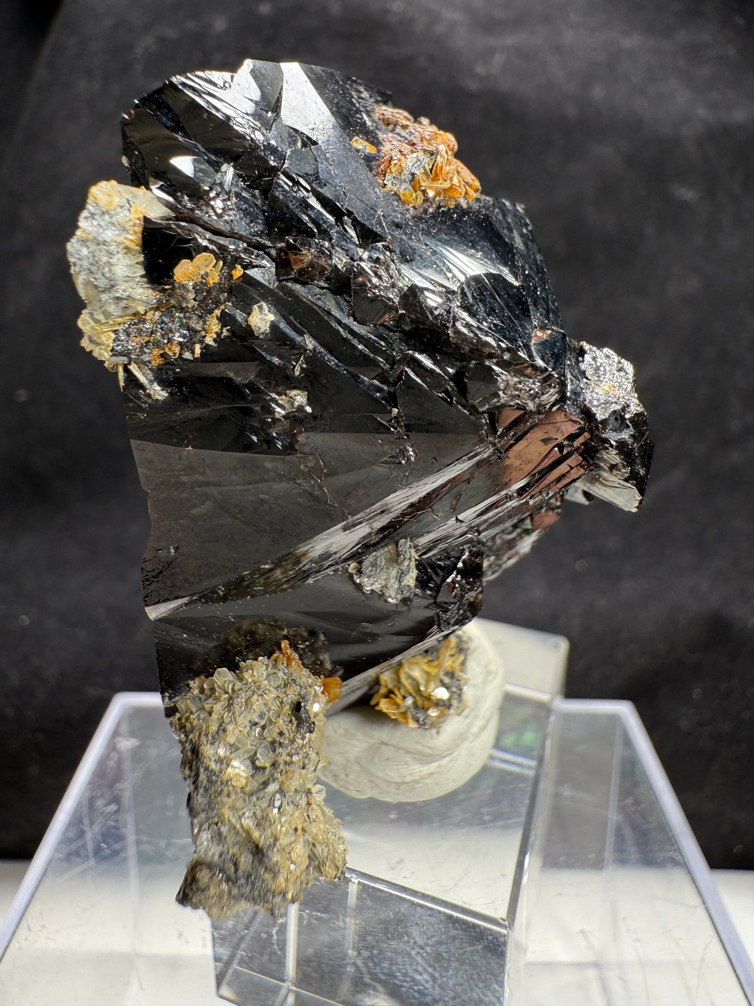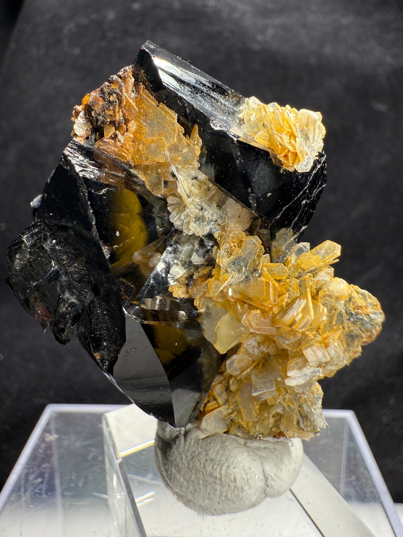 A stunning black metallic Cassiterite crystal displaying sharp form and brilliant luster. The crystal is accompanied by silvery Muscovite plates, adding texture and contrast to the composition. This is a highly aesthetic specimen from the renowned Xuebaoding locality in Sichuan, China — famous for producing world-class Cassiterite and associated minerals of exceptional quality. 4.6 x 3.6 x 3.0 cm