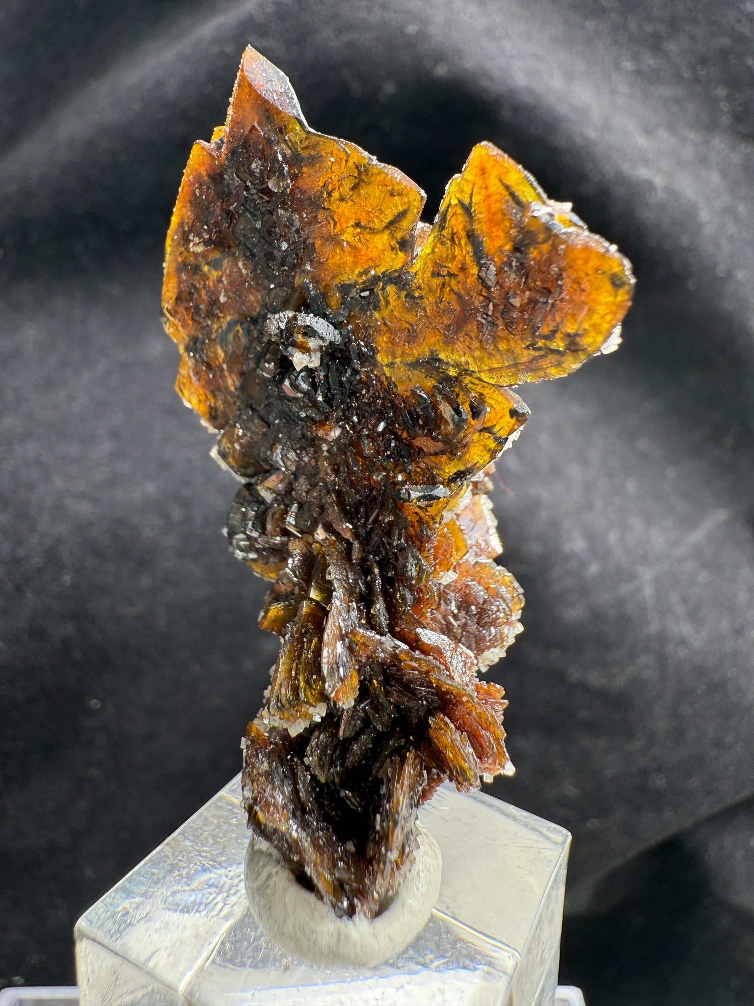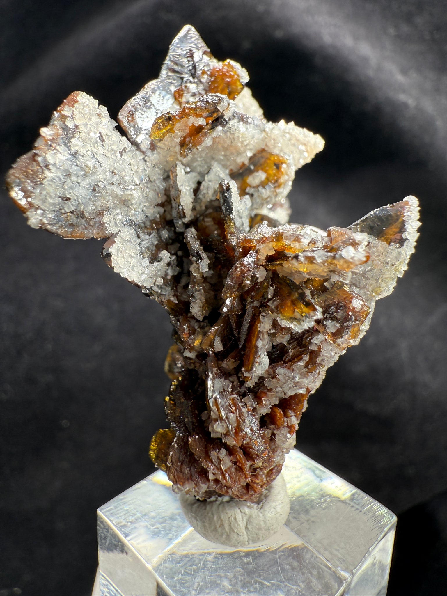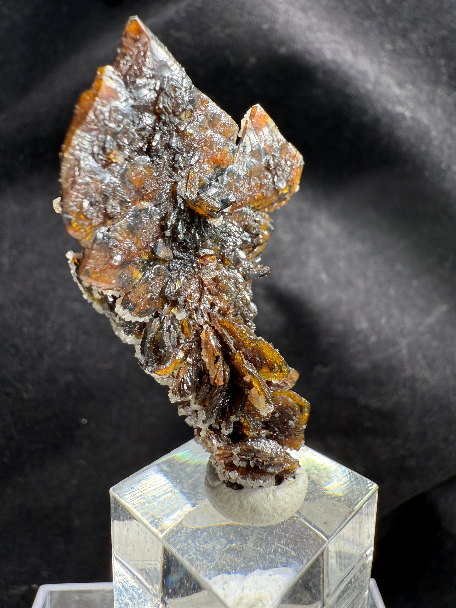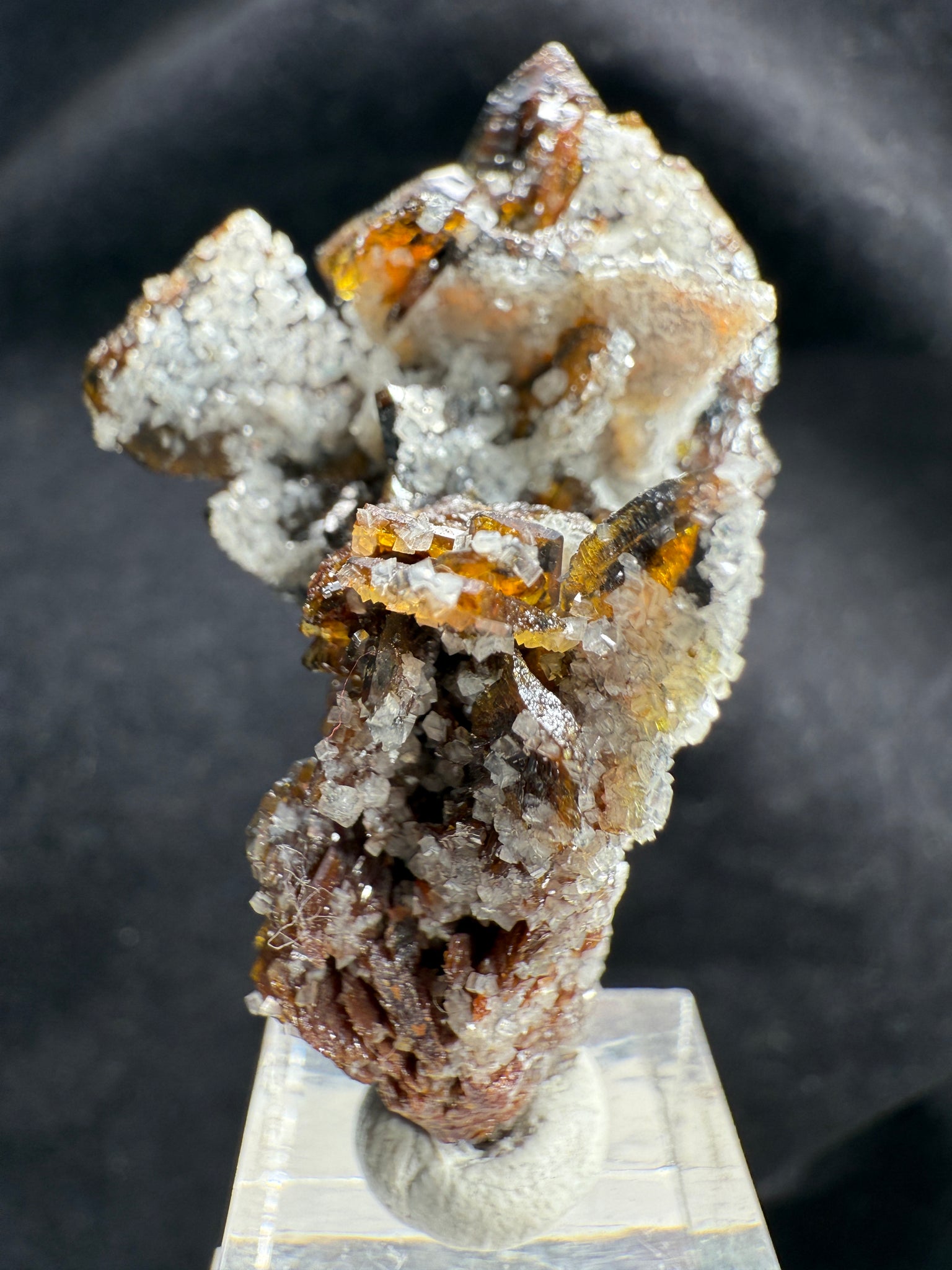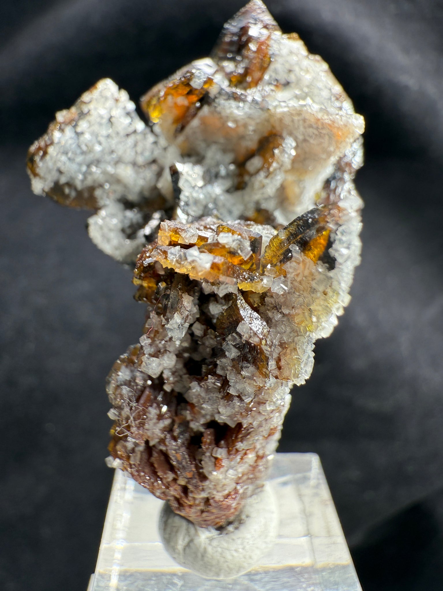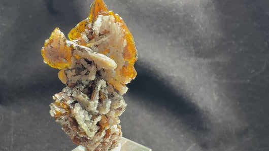 A superb, fully terminated Descloizite crystal with a warm brown hue, elegantly coated on one side with lustrous Calcite. This floater specimen is completely damage-free and exhibits exceptional crystallization. A high-quality example from the world’s most renowned locality for this species — Grootfontein, South Africa. 4.5 x 2.7 x 2.2 cm