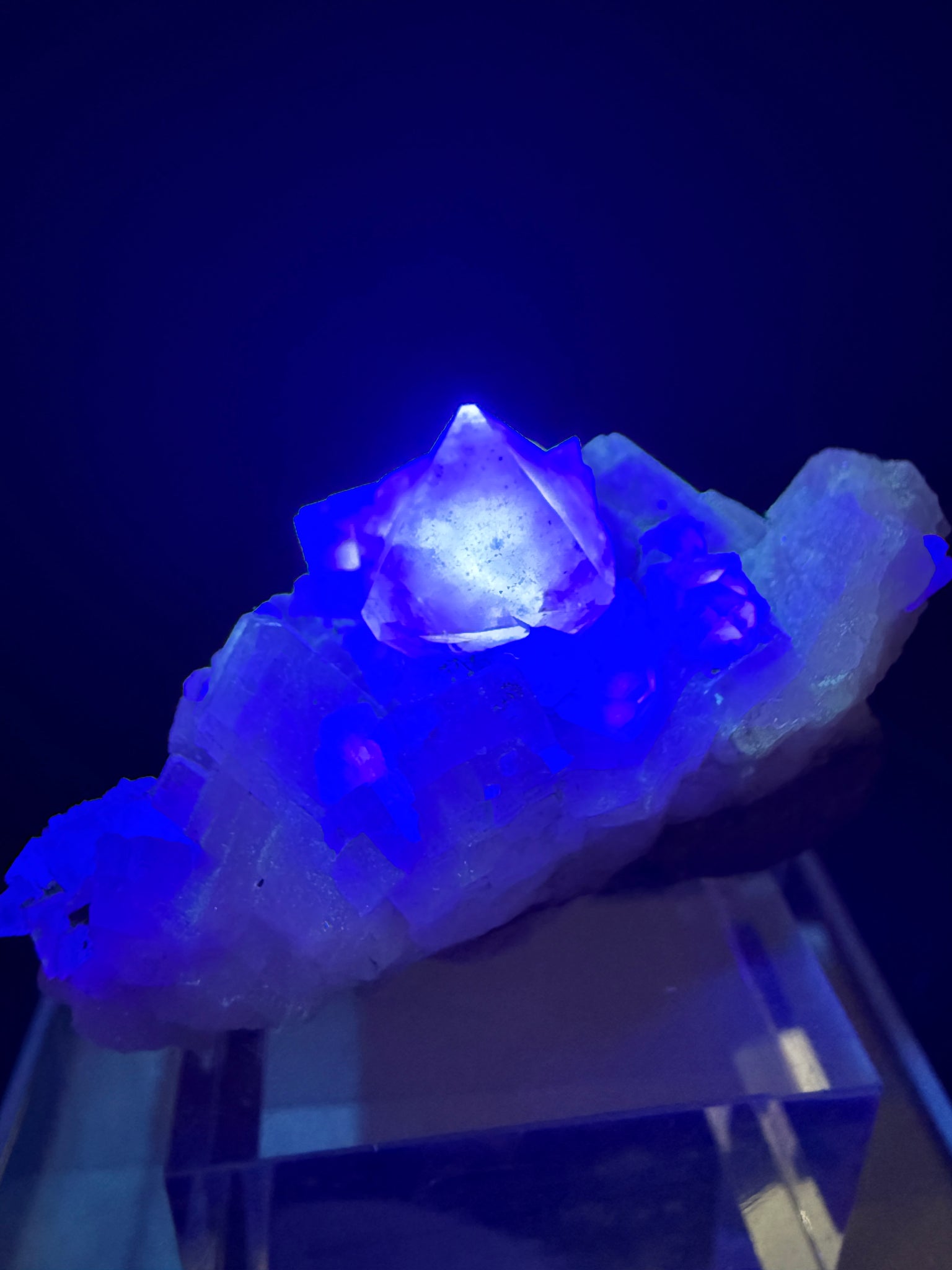 A gem-quality, perfectly formed green Fluorite octahedron accompanied by several smaller, well-defined octahedrons. The Fluorite shows bright transparency and rich green color, beautifully contrasted by white Calcite crystals. A fine and aesthetic specimen from Godbout, Québec, Canada. 4.3 x 2.9 x 2.4 cm. It reacts well under UV.