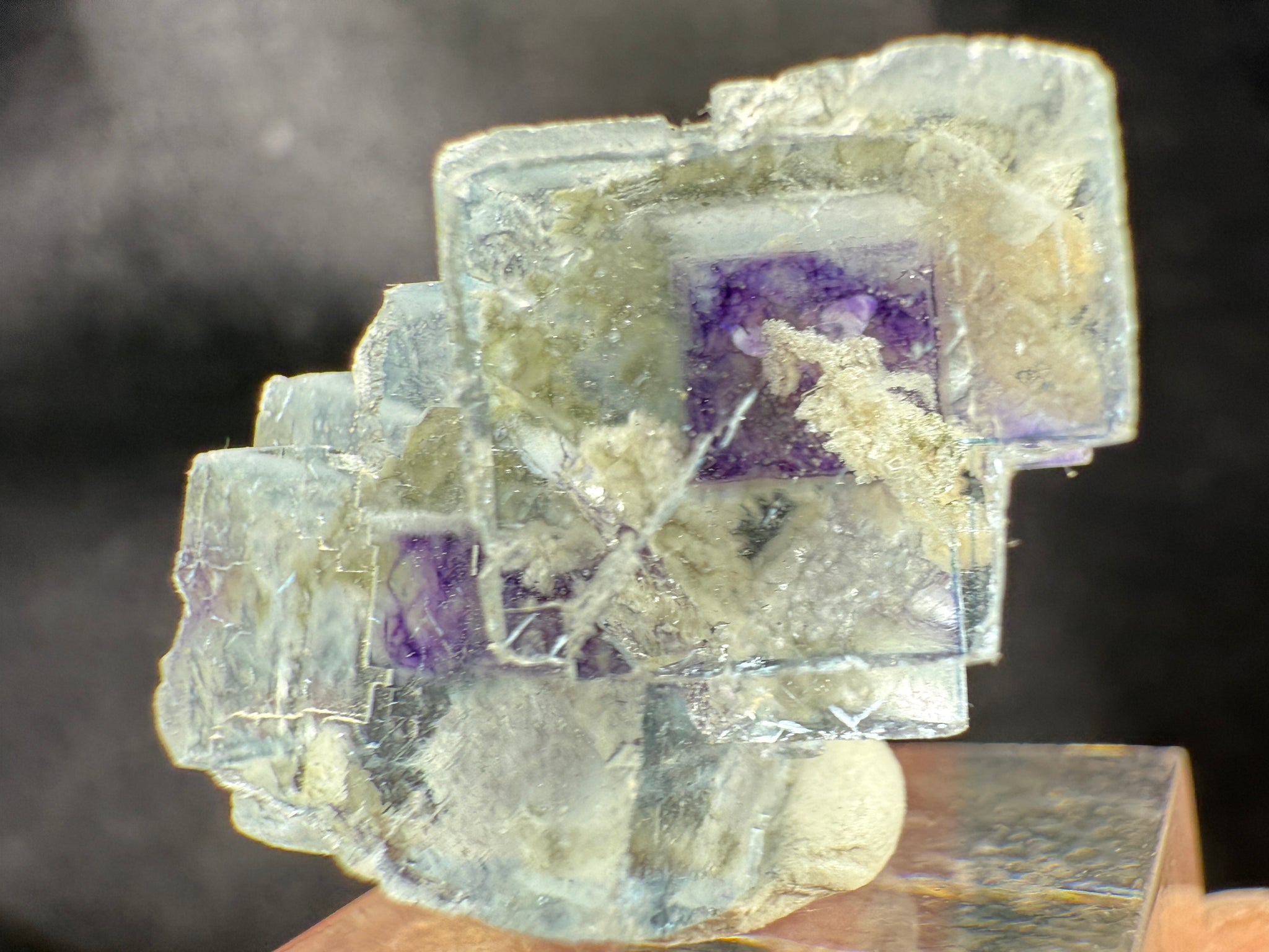 Blue, glassy Fluorite crystals with high transparency on the front face. The two main crystals display striking, well-defined deep purple zoning that adds superb contrast and aesthetics. A perfect, balanced specimen for a fine miniature collection.