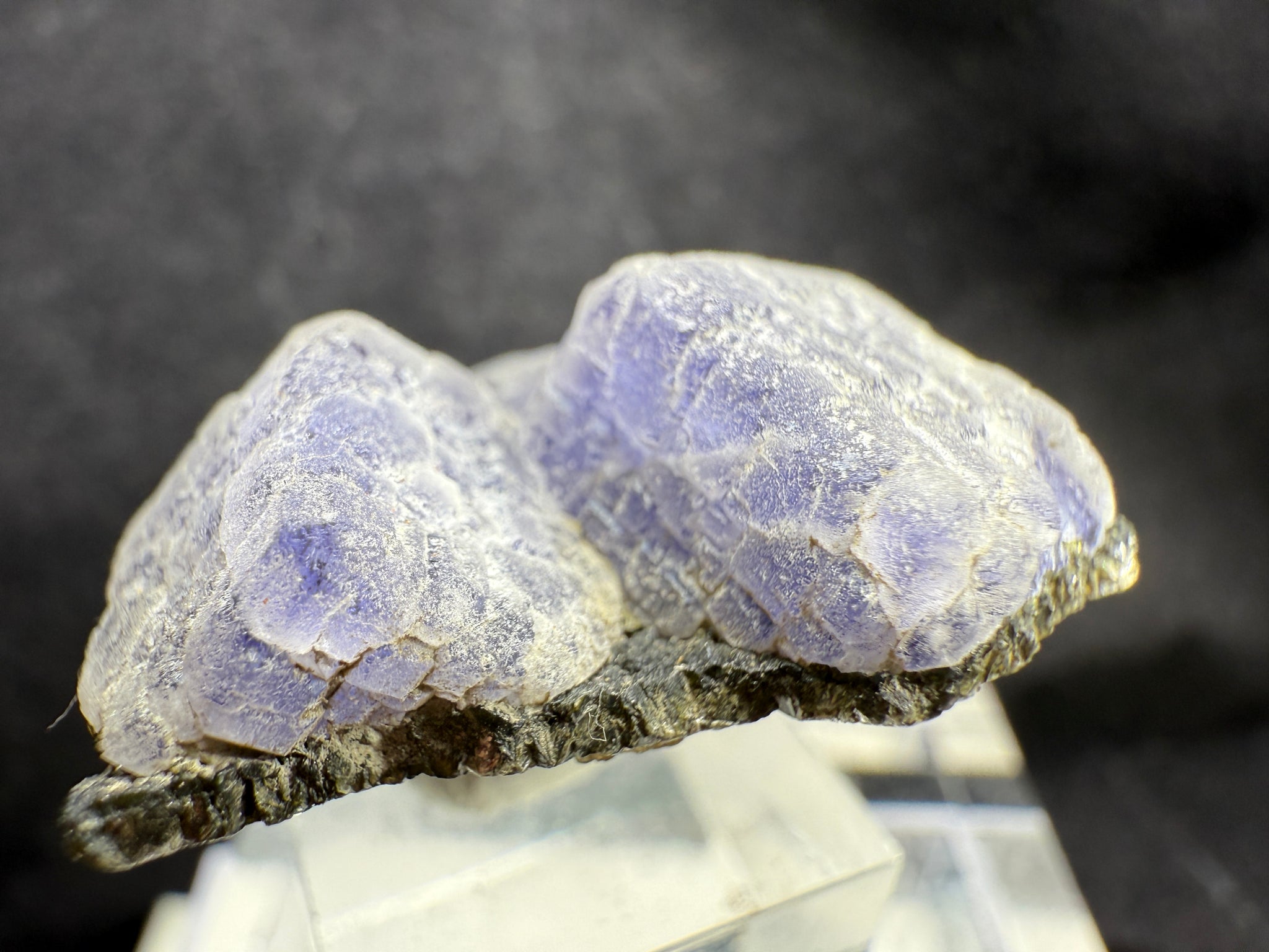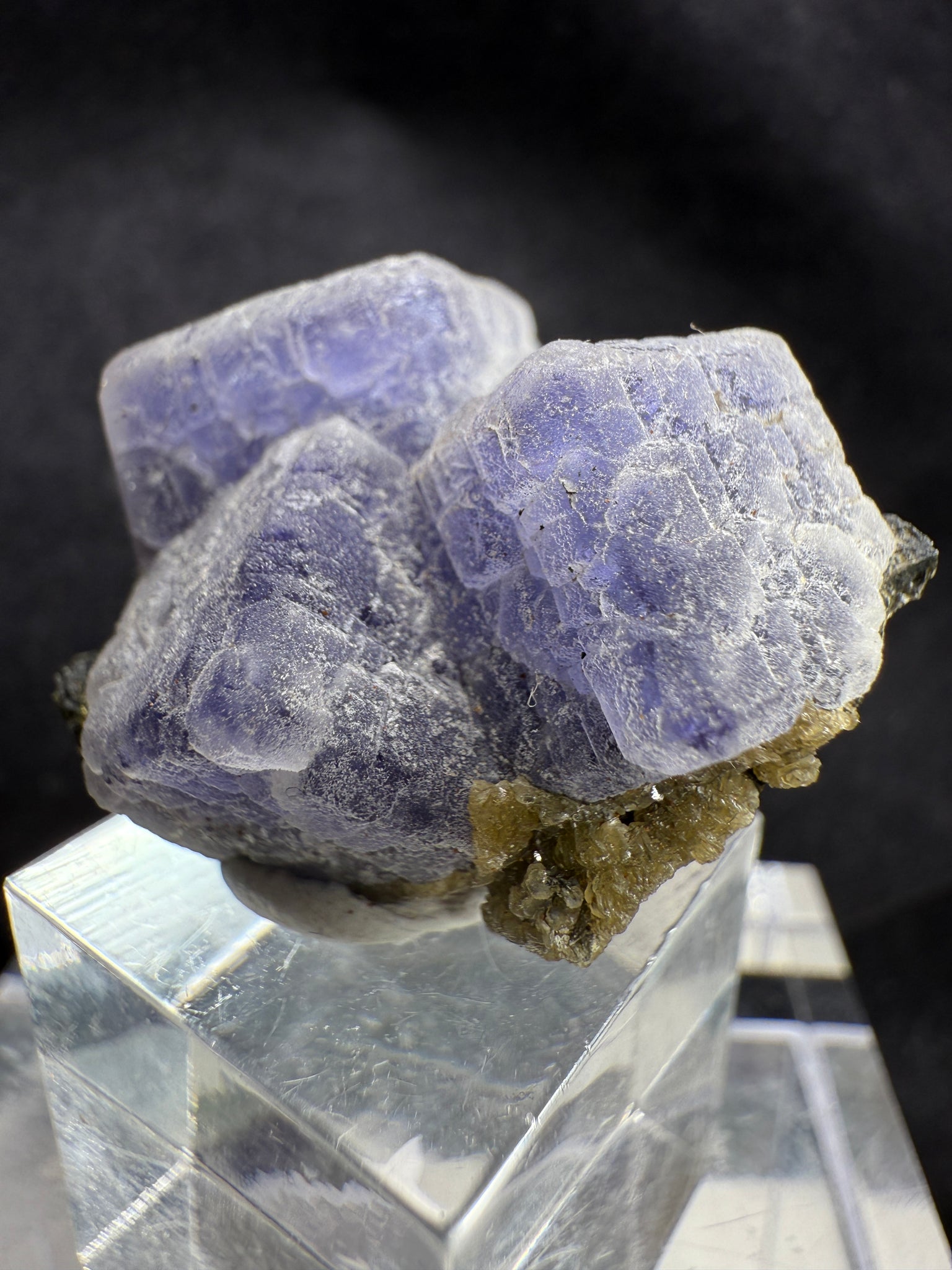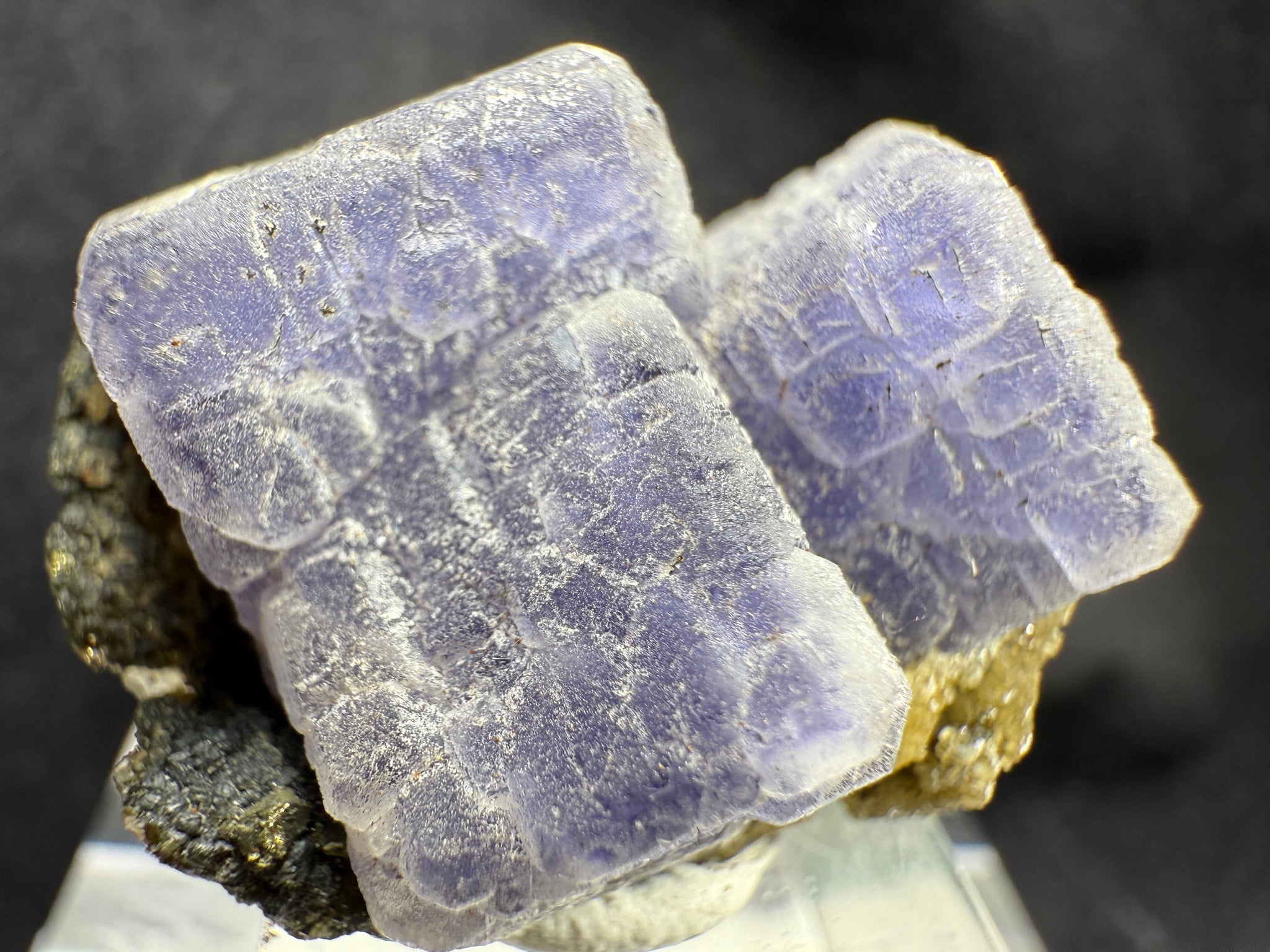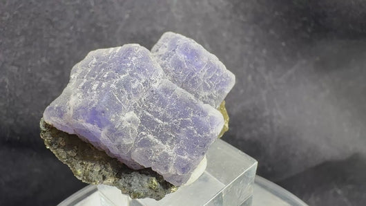 Three well-formed purple Fluorite crystals showing subtle surface modifications with smaller cubic growths. The crystals are in excellent condition, elegantly set on a Muscovite-covered matrix with Siderite associations. A fine and aesthetic piece from the Panasqueira mine, Portugal. 3.2 x 2.5 x 1.5 cm
