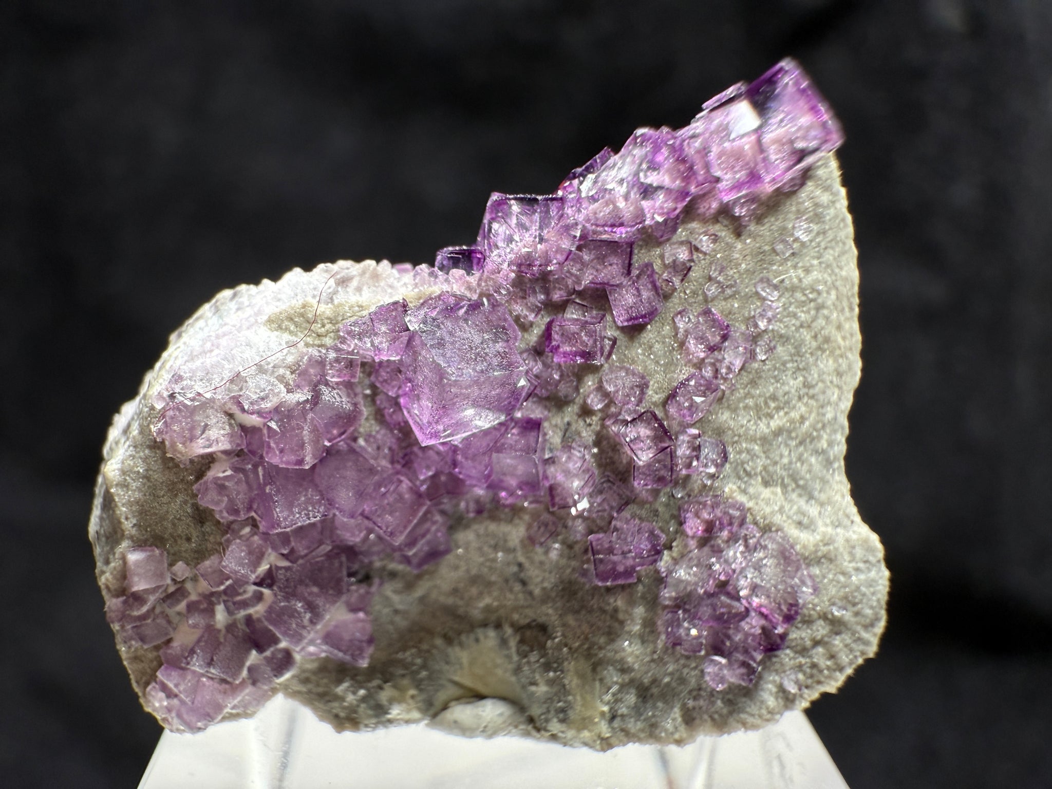 Gemmy purple fluorite from St-Philippe-de-La Prairie, Quebec, Canada. A choice thumbnail with appealing color saturation in a compact format, perfect for focused thumbnail trays or as a bright accent in a mixed cabinet. 2.4 × 1.7 × 0.8 cm