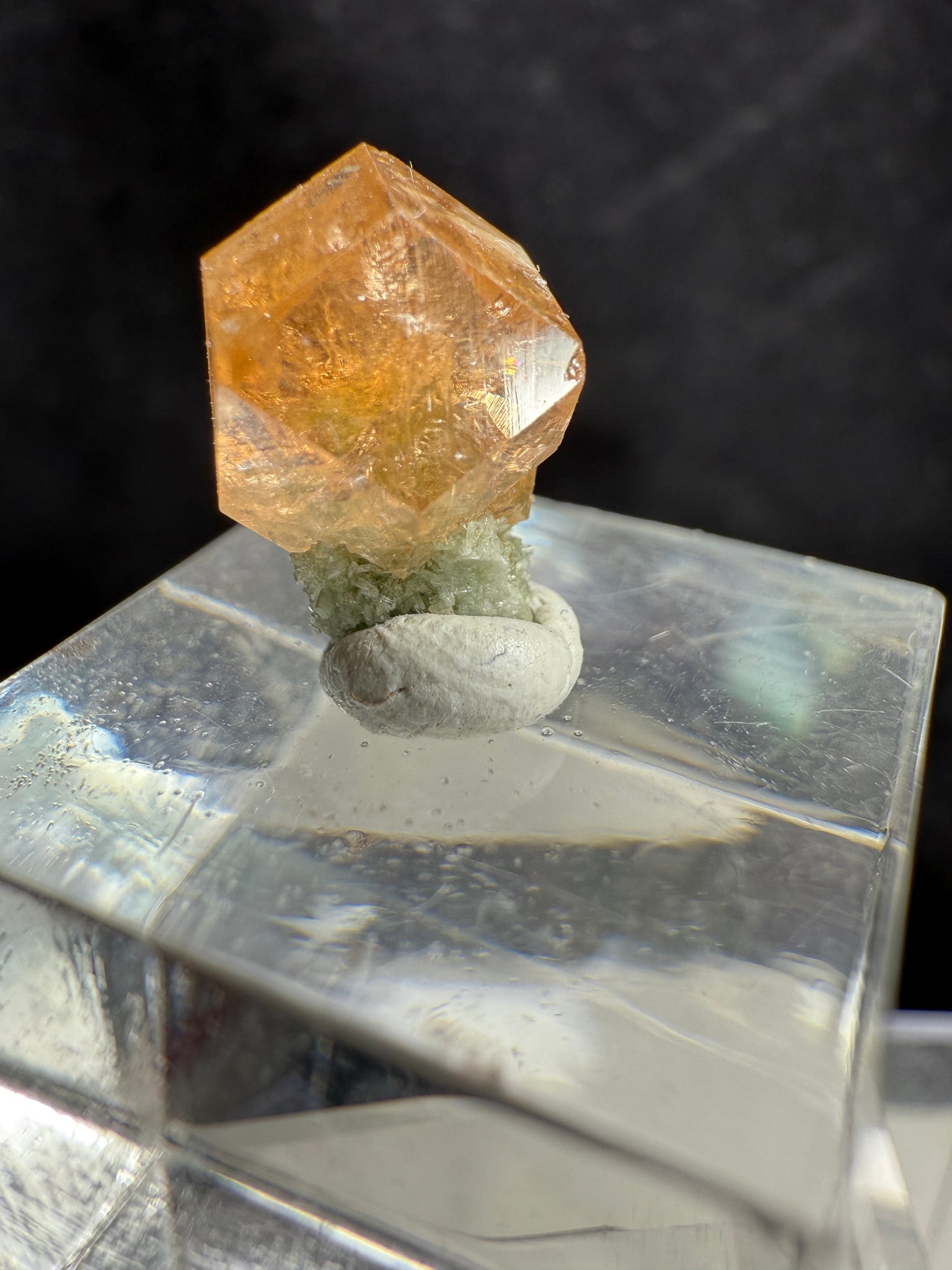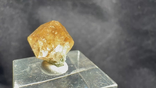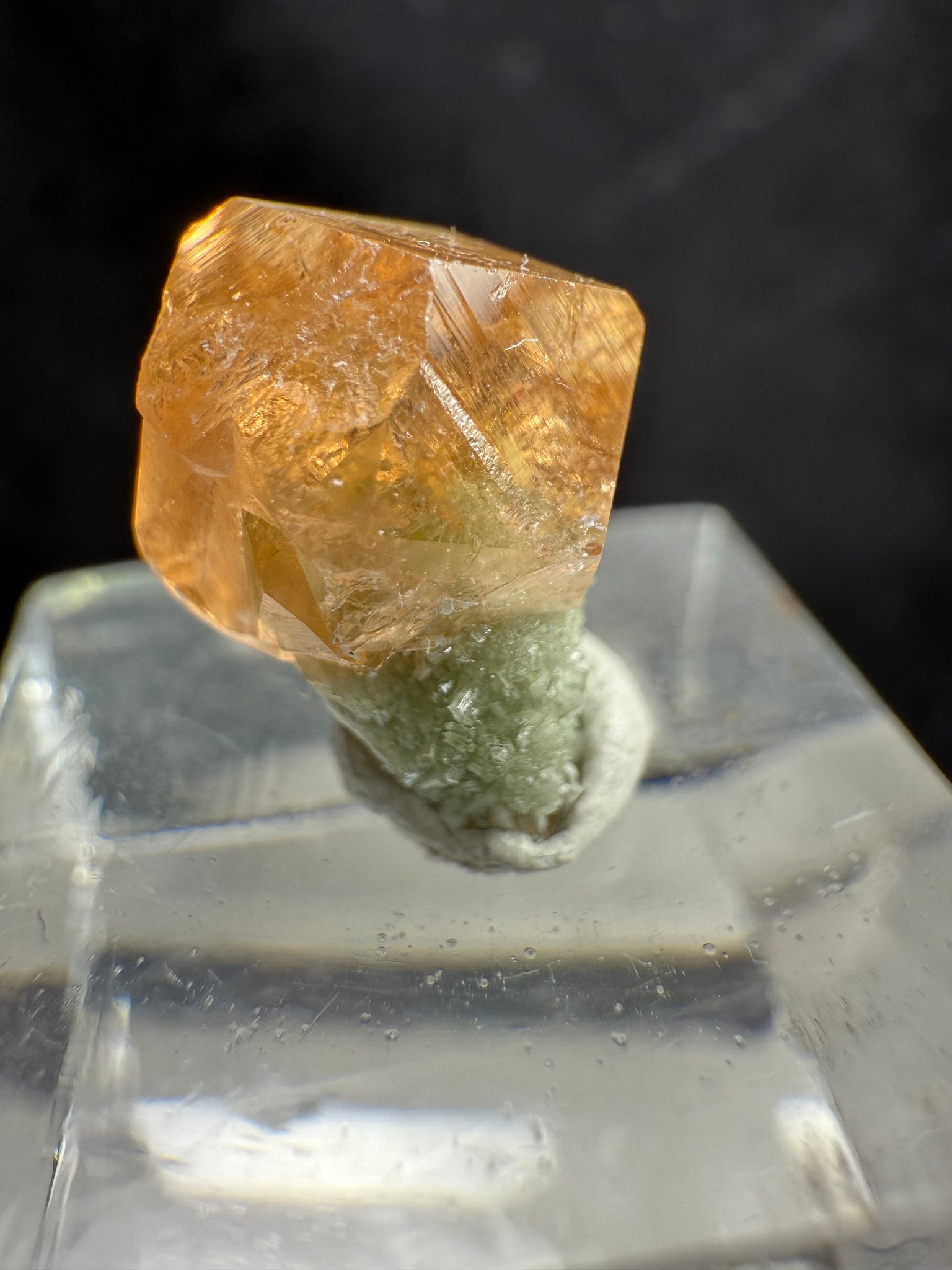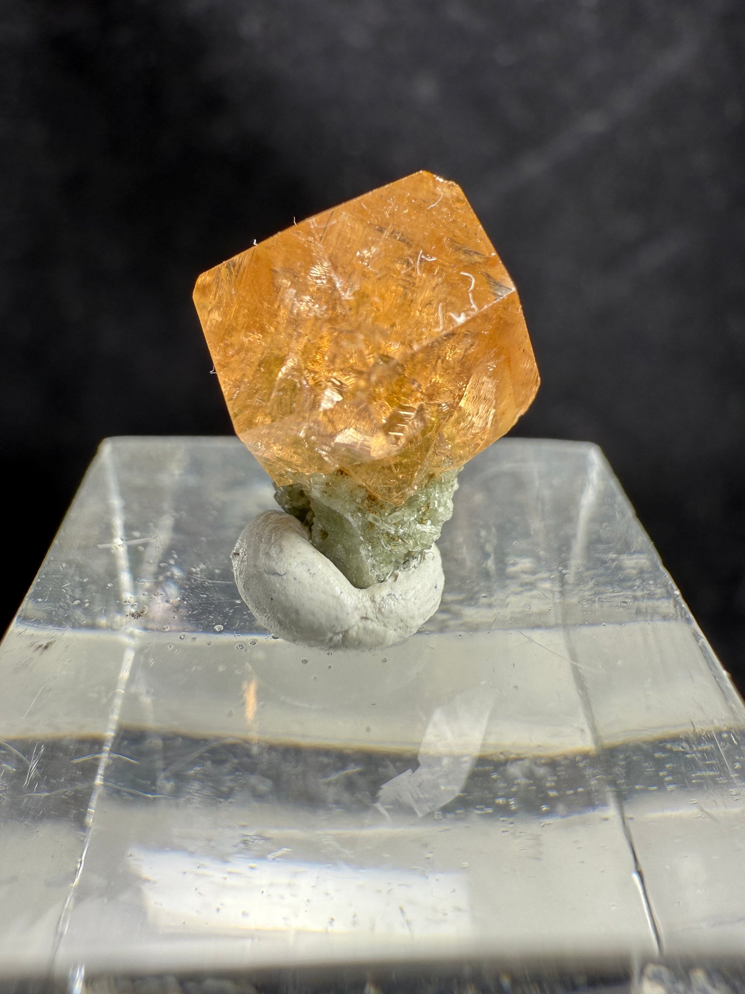 A beautiful gem-quality Garnet crystal showing good faces and bright orange color, perched over green Diopside. The Garnet is transparent and sparkly, with only minimal bruising on some edges. The contrast between the vivid orange Garnet and the green Diopside creates a striking visual combination. A fine and colorful specimen from the famous Jeffrey Mine in Québec, Canada. 1.2 x 0.8 x 0.7 cm