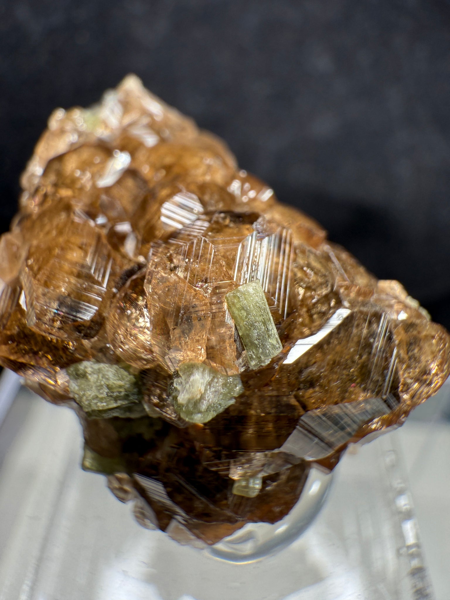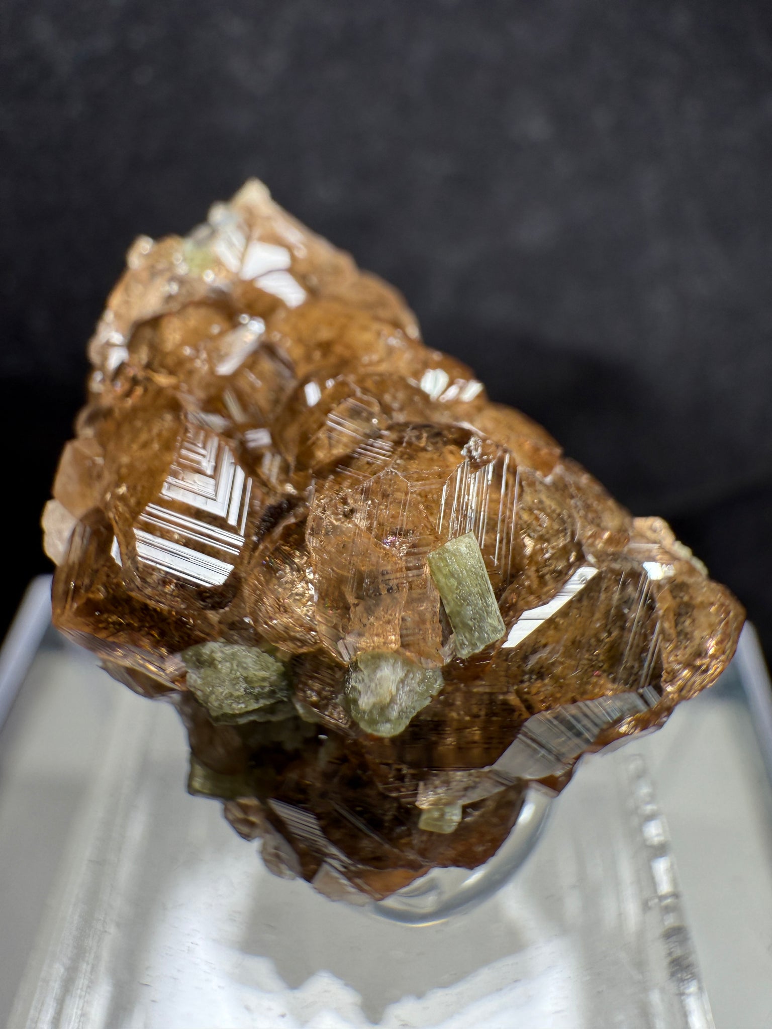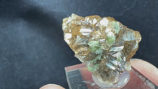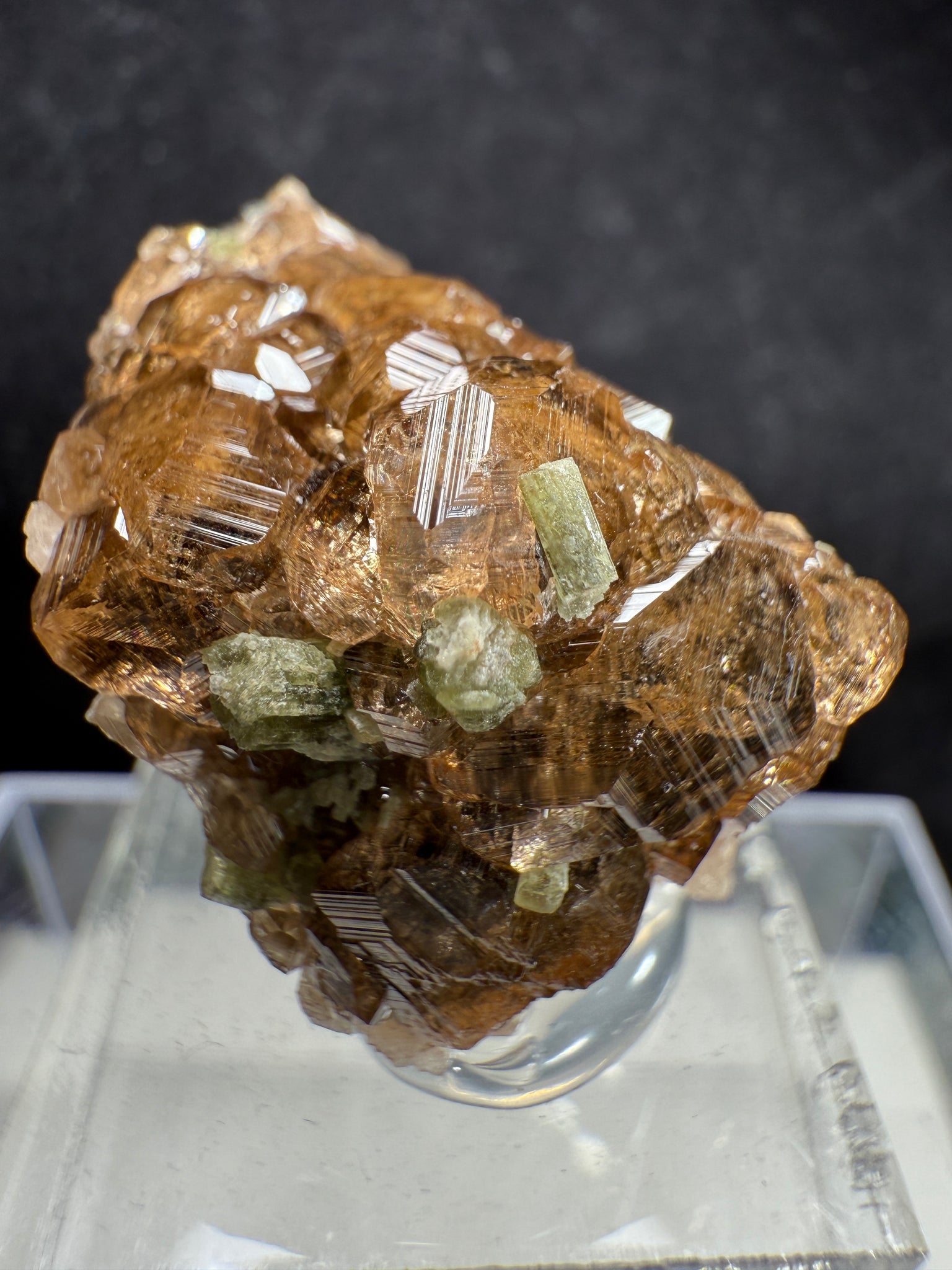 A gemmy Hessonite Garnet displaying a deep brown color with sharp striations on all crystal faces. It is attractively associated with green Diopside, creating a beautiful color contrast that enhances the overall aesthetic. A fine and eye-catching specimen from the famous Jeffrey Mine, Val-des-Sources, Quebec, Canada. 2.5 x 2.3 x 2.3 cm