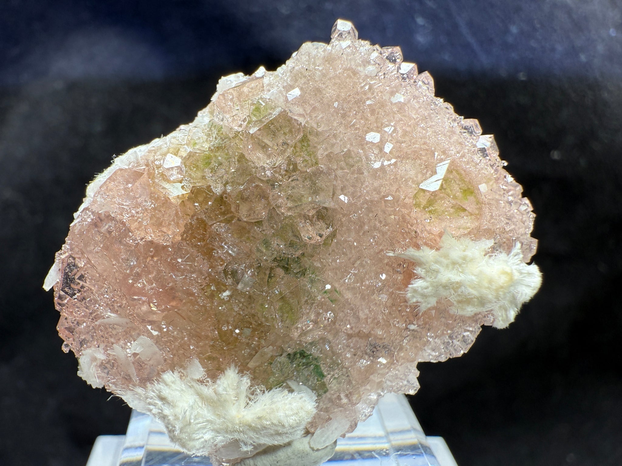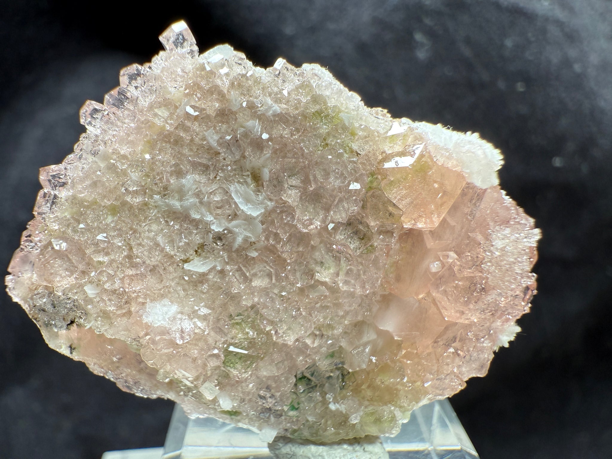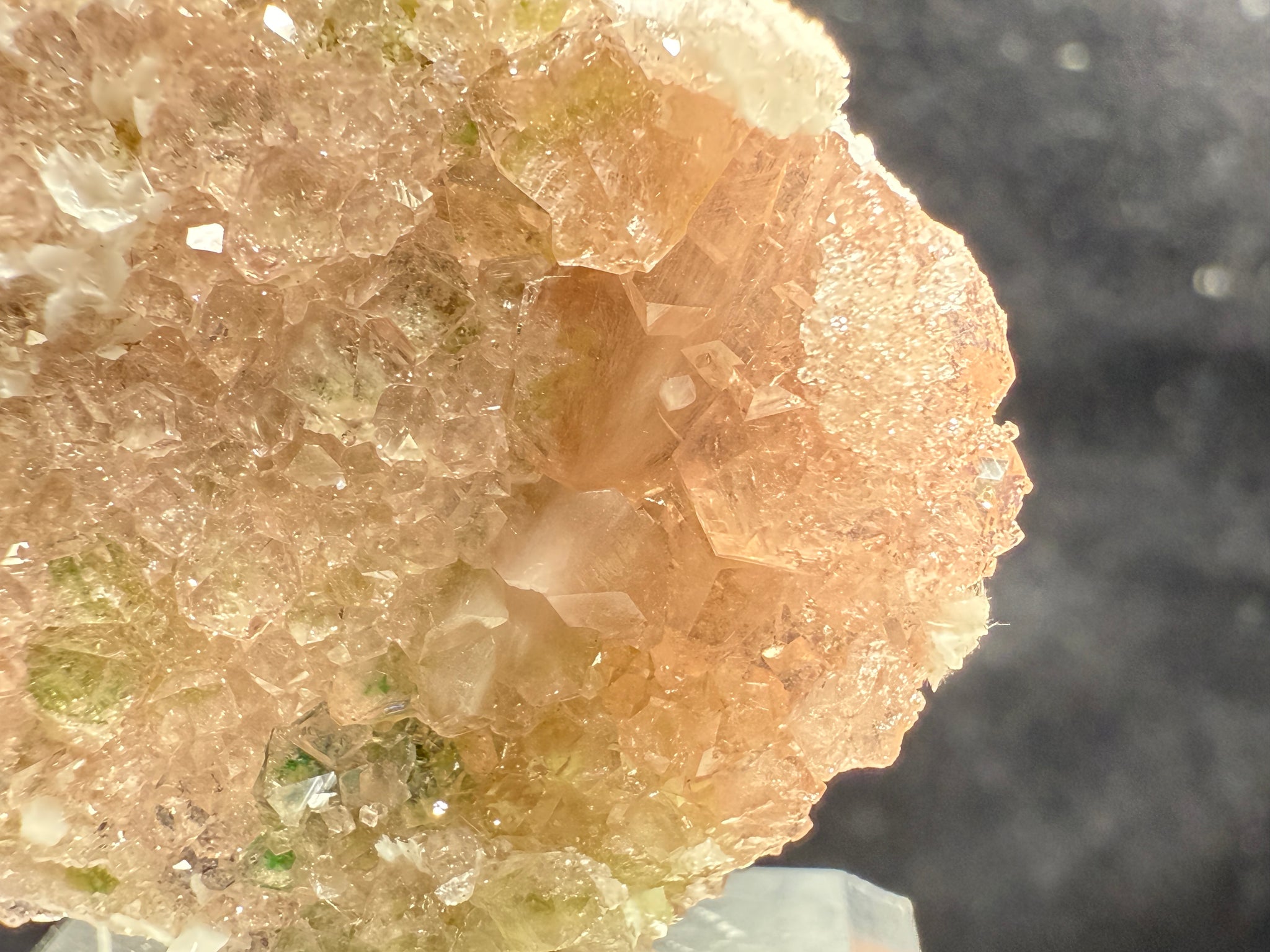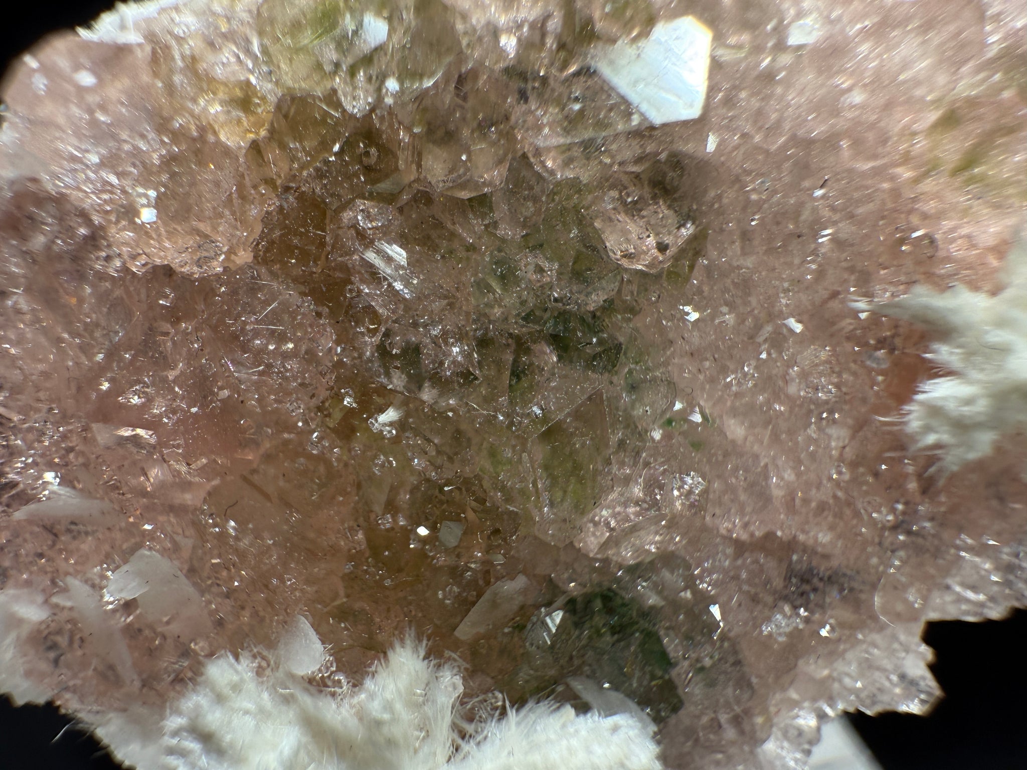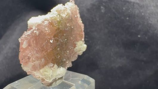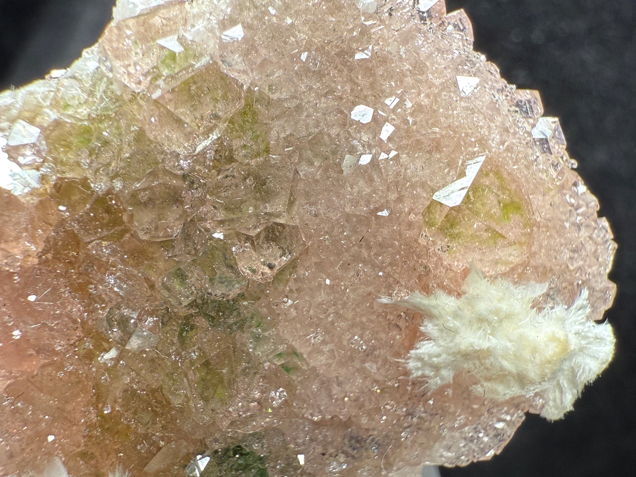 A rare double-sided crystallized pink Garnet from the famous Jeffrey Mine. The crystals are gemmy and transparent, with portions covered in clusters of tiny, well-formed crystals of pure pink. Some crystals display greenish internal hues, likely due to chromium inclusions — an uncommon and striking feature rarely seen in Jeffrey Mine Garnets. A beautiful and unusual specimen for connoisseurs of this locality. 3.3 x 2.4 x 0.7 cm