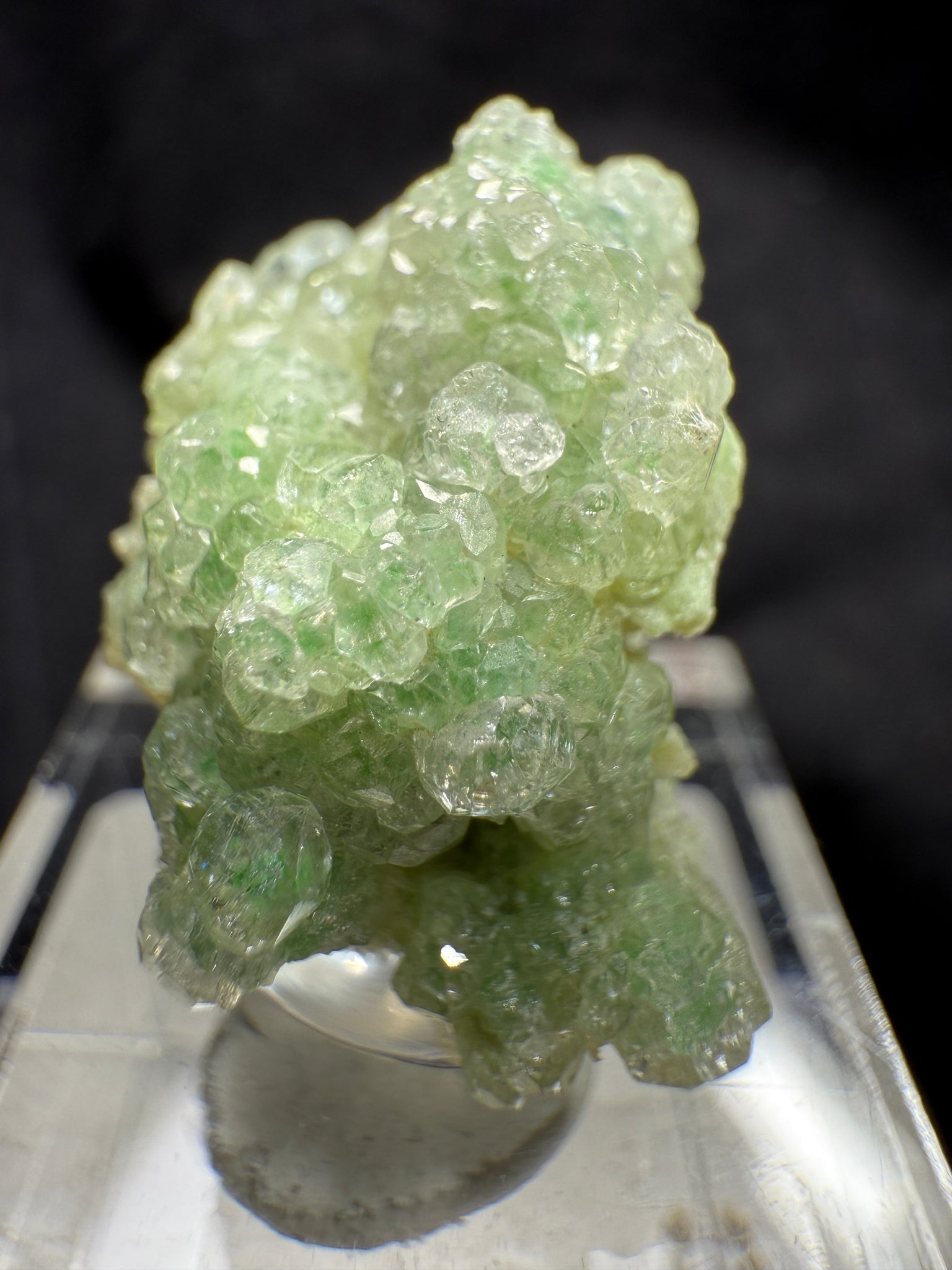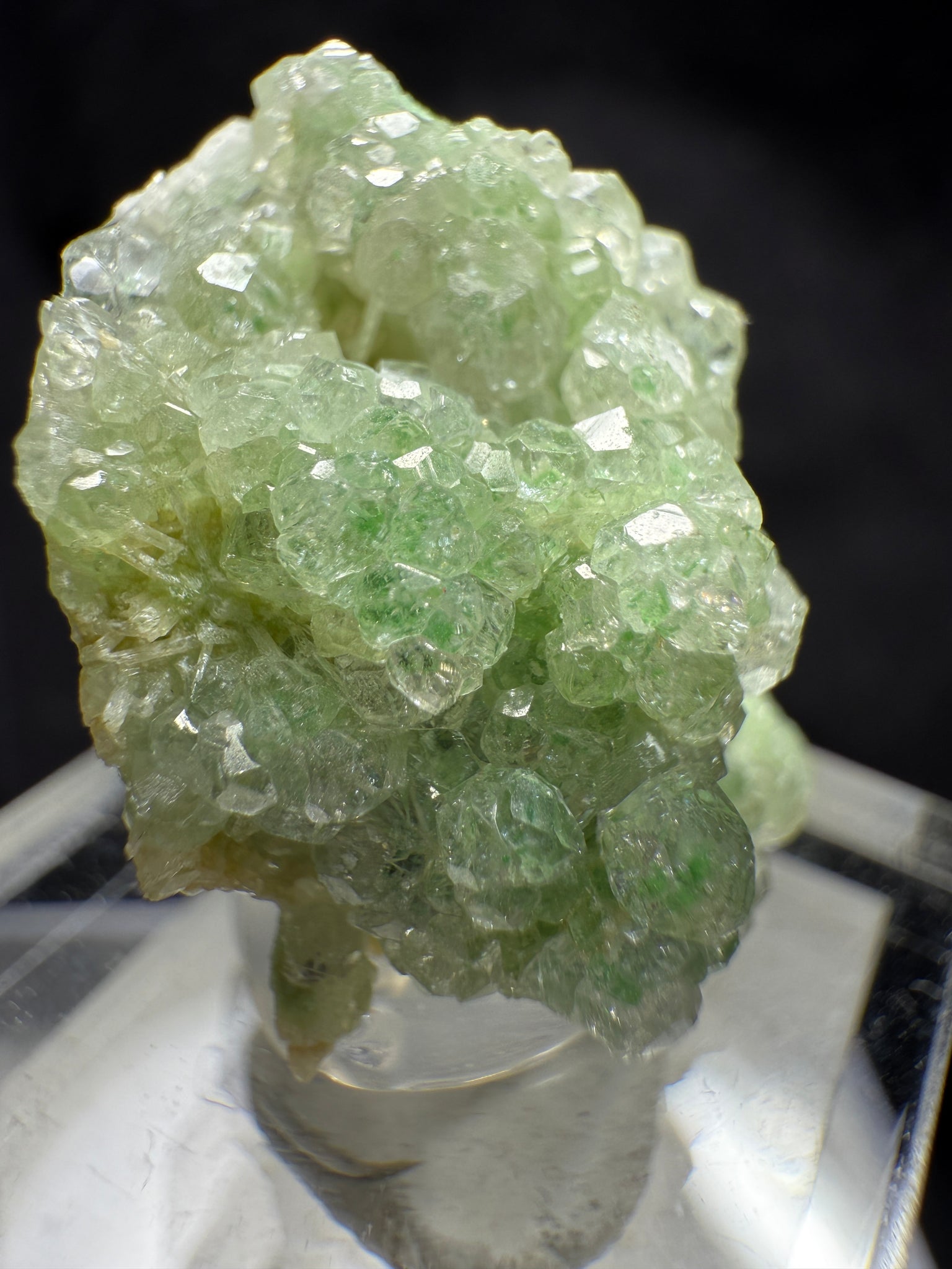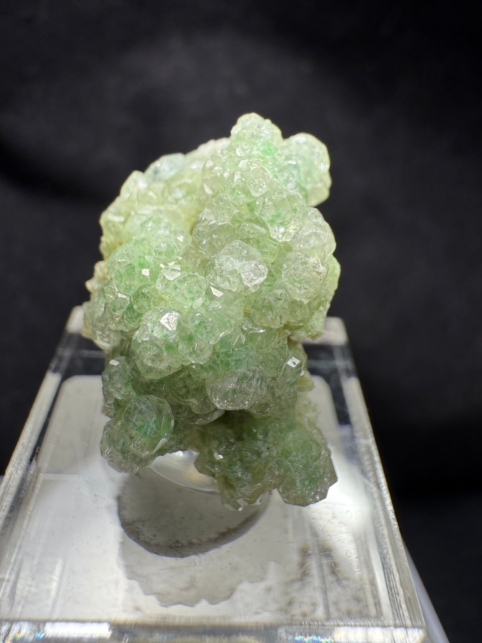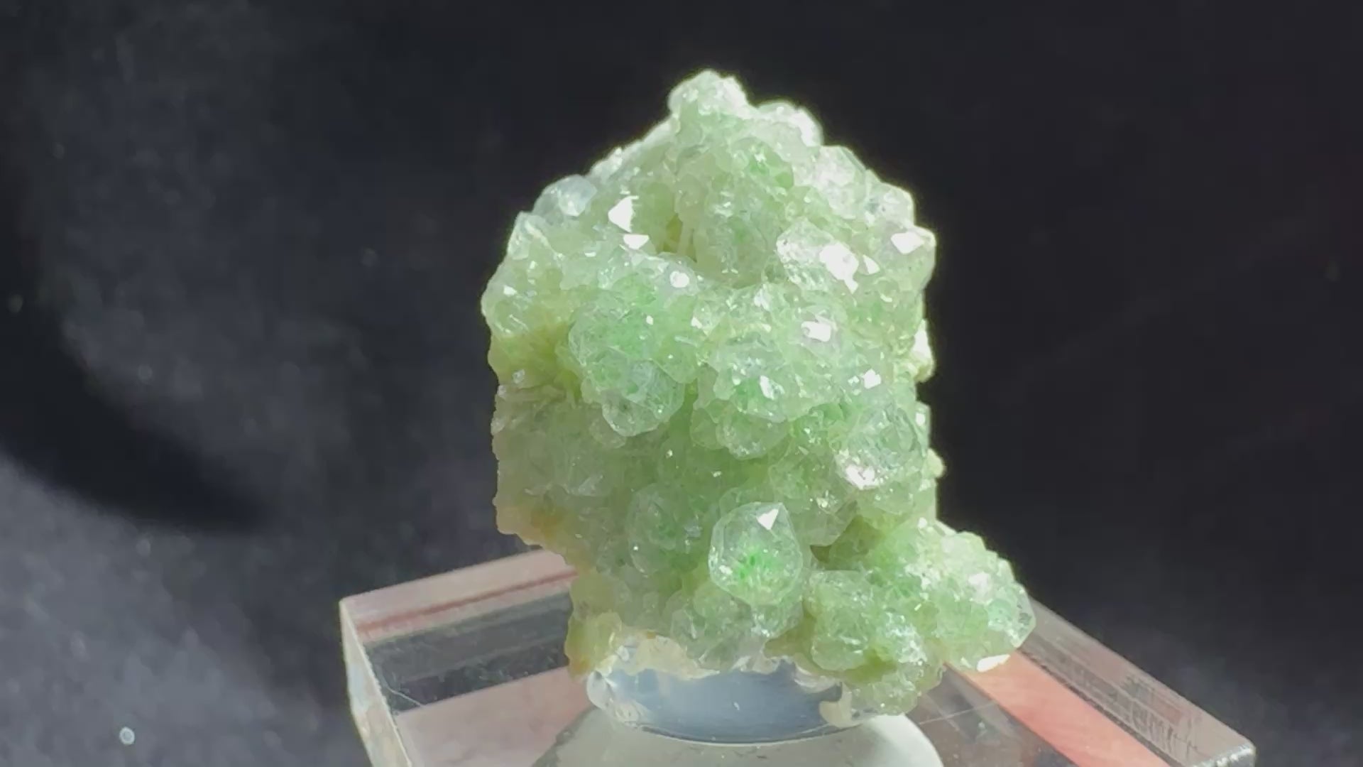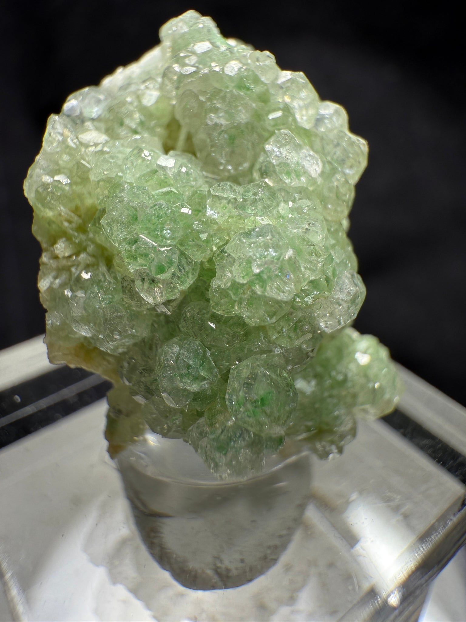 Transparent Garnet cluster featuring chromium inclusions that create striking green hues within the crystals. A fine and distinctive specimen from the famous Jeffrey mine, Québec, Canada. 2.1 x 1.7 x 1.7 cm