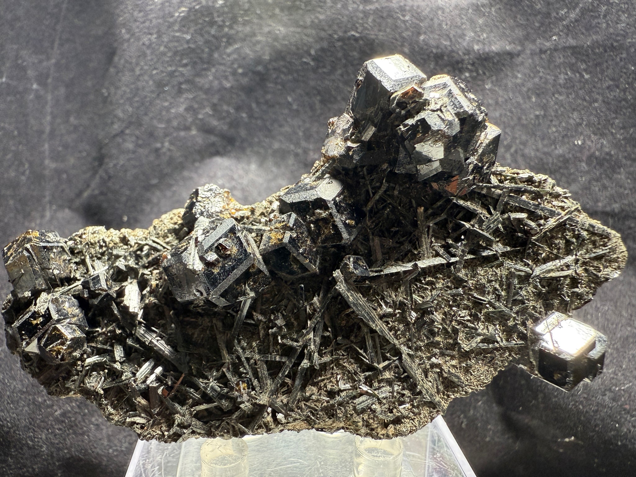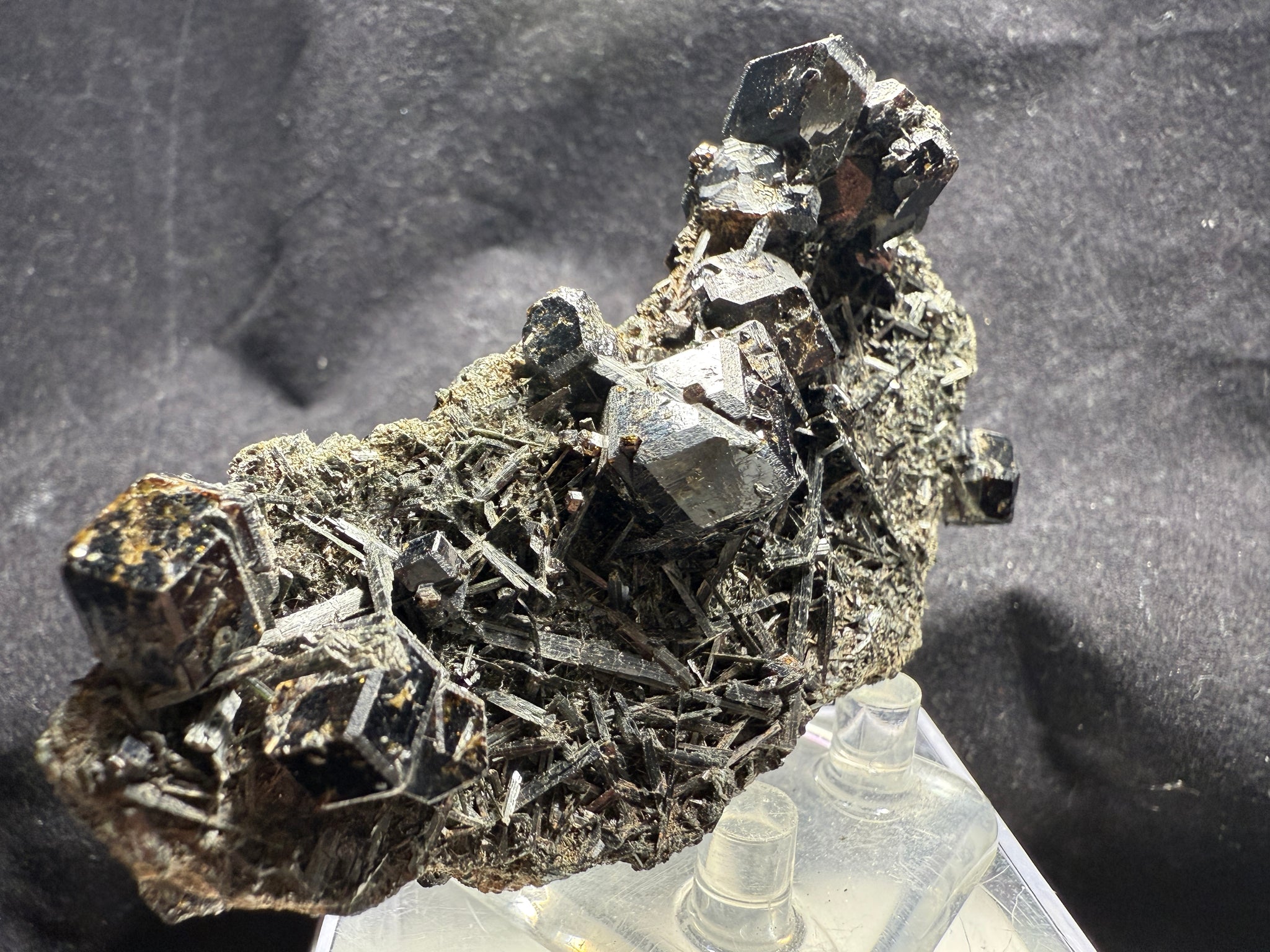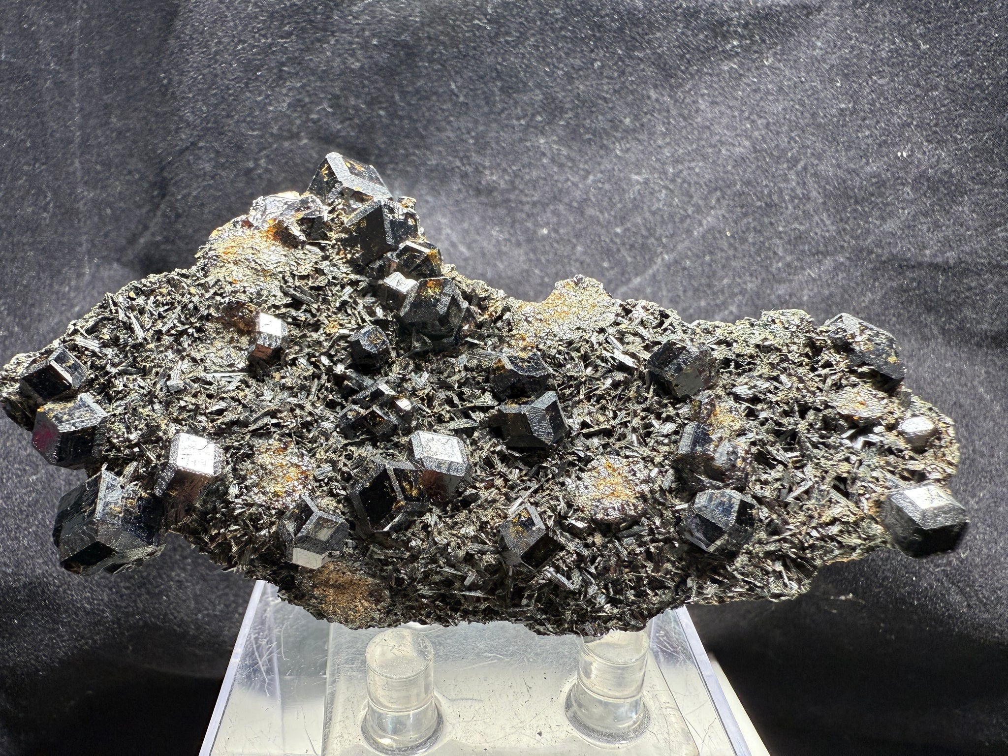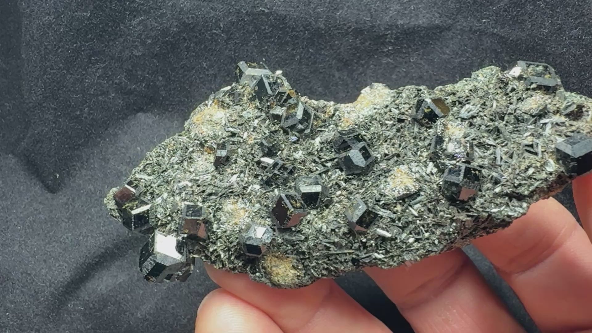 A wonderful double-sided specimen featuring lustrous black Melanite garnets associated with rich green Epidote crystals. The sharp contrast and high luster make this a striking and aesthetic piece from Diakon, Mali — a classic locality known for its elegant Garnet–Epidote combinations. 9.4 x 5.1 x 2.0 cm