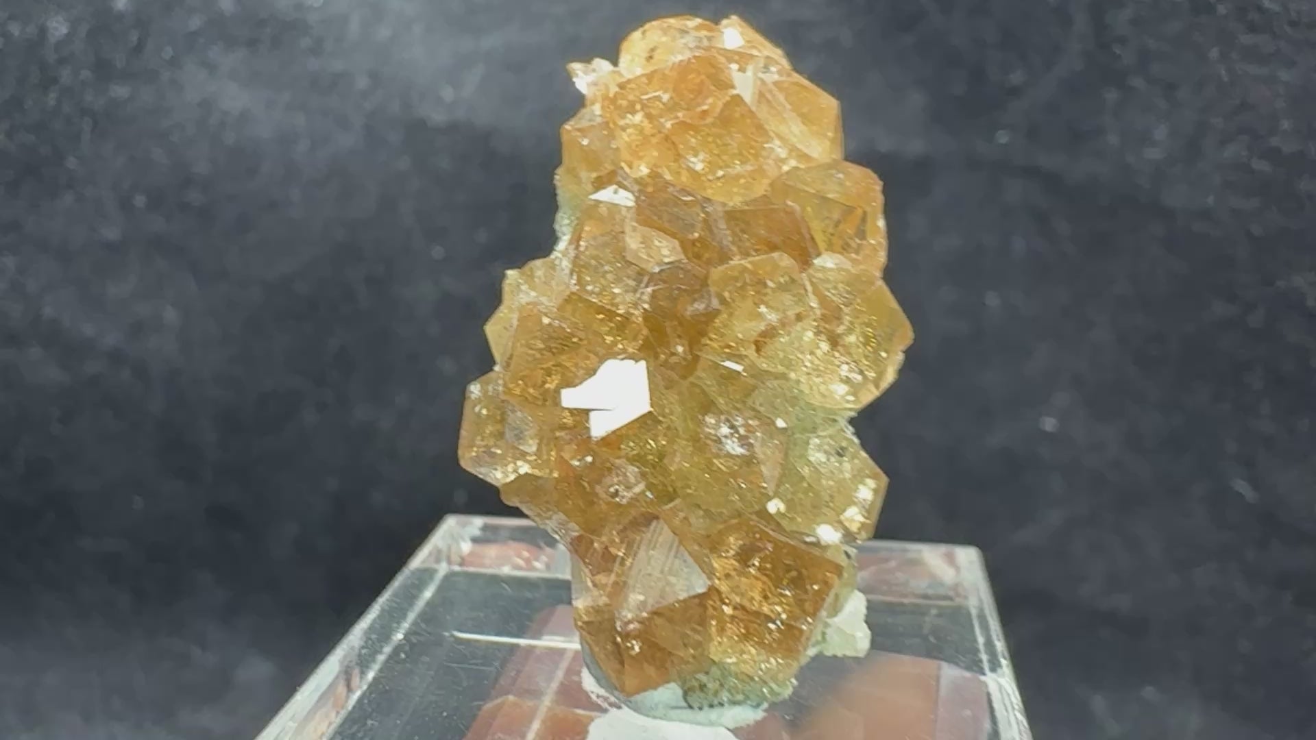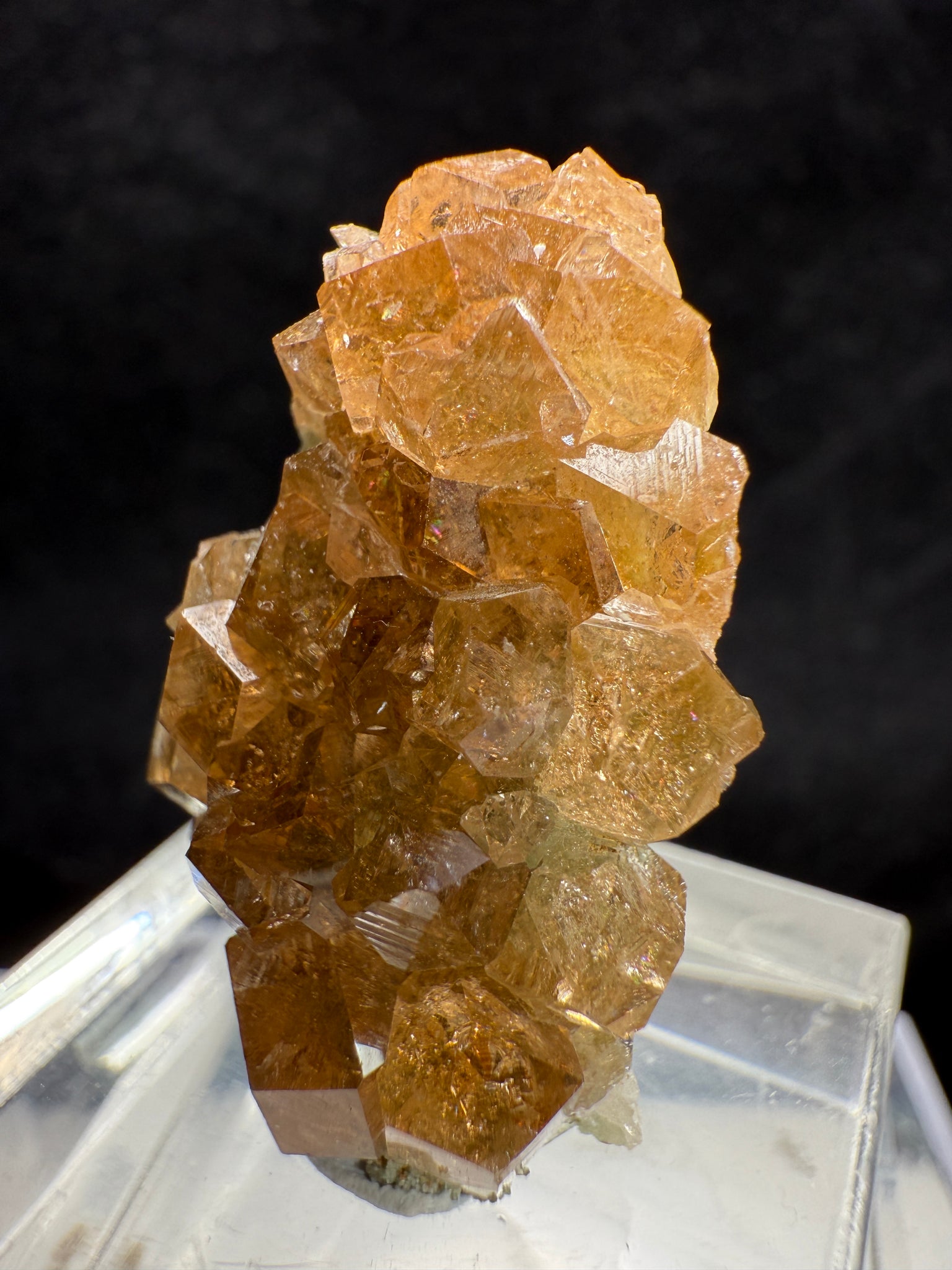 A beautiful cluster of gem Hessonite Garnets showing excellent crystal definition and clarity. The crystals display a warm peachy hue and are attractively associated with green Diopside crystals on the back, adding color contrast and character to the piece. A classic and desirable combination from the famous Jeffrey Mine. 3.0 x 1.9 x 1.8 cm