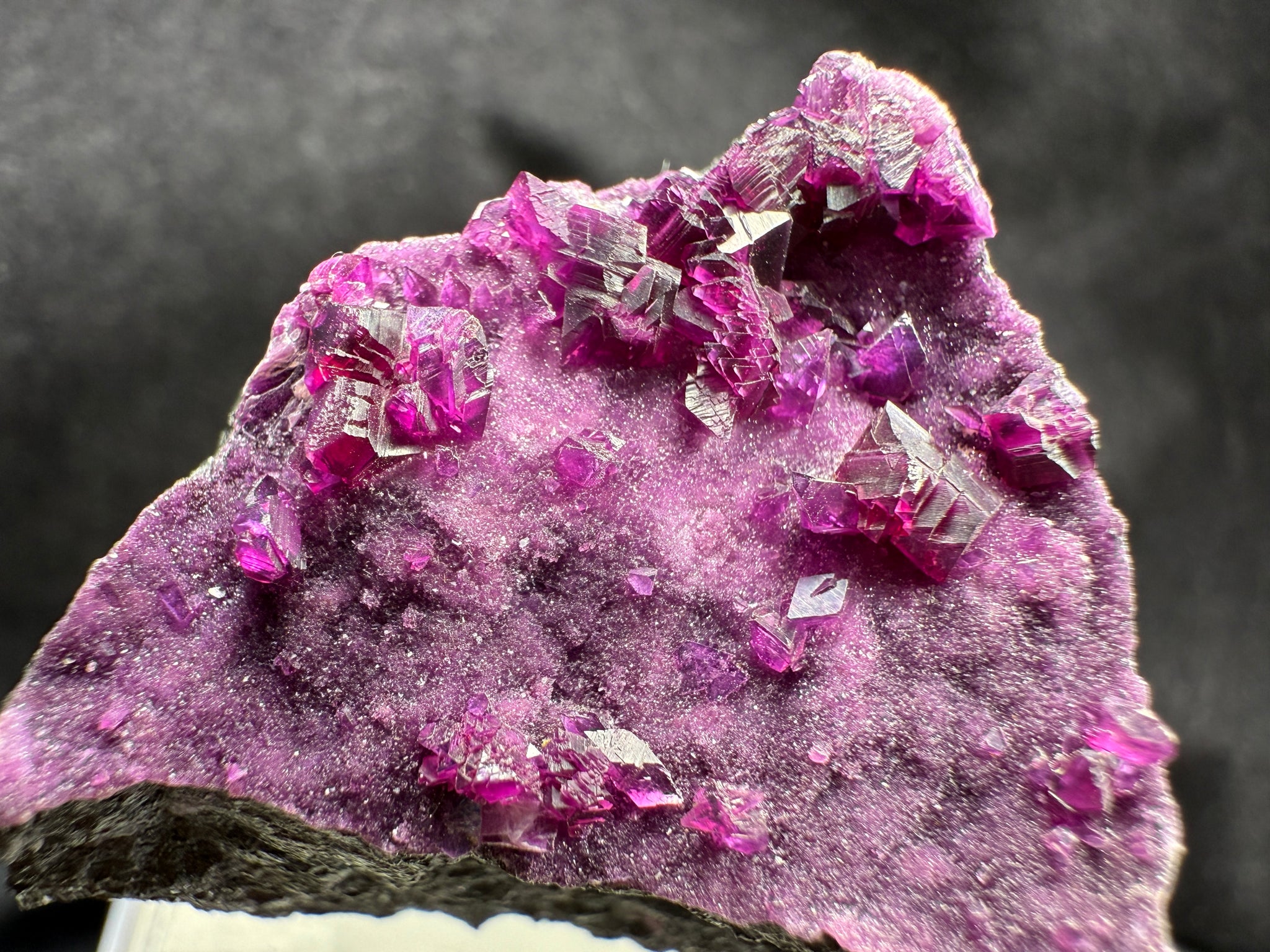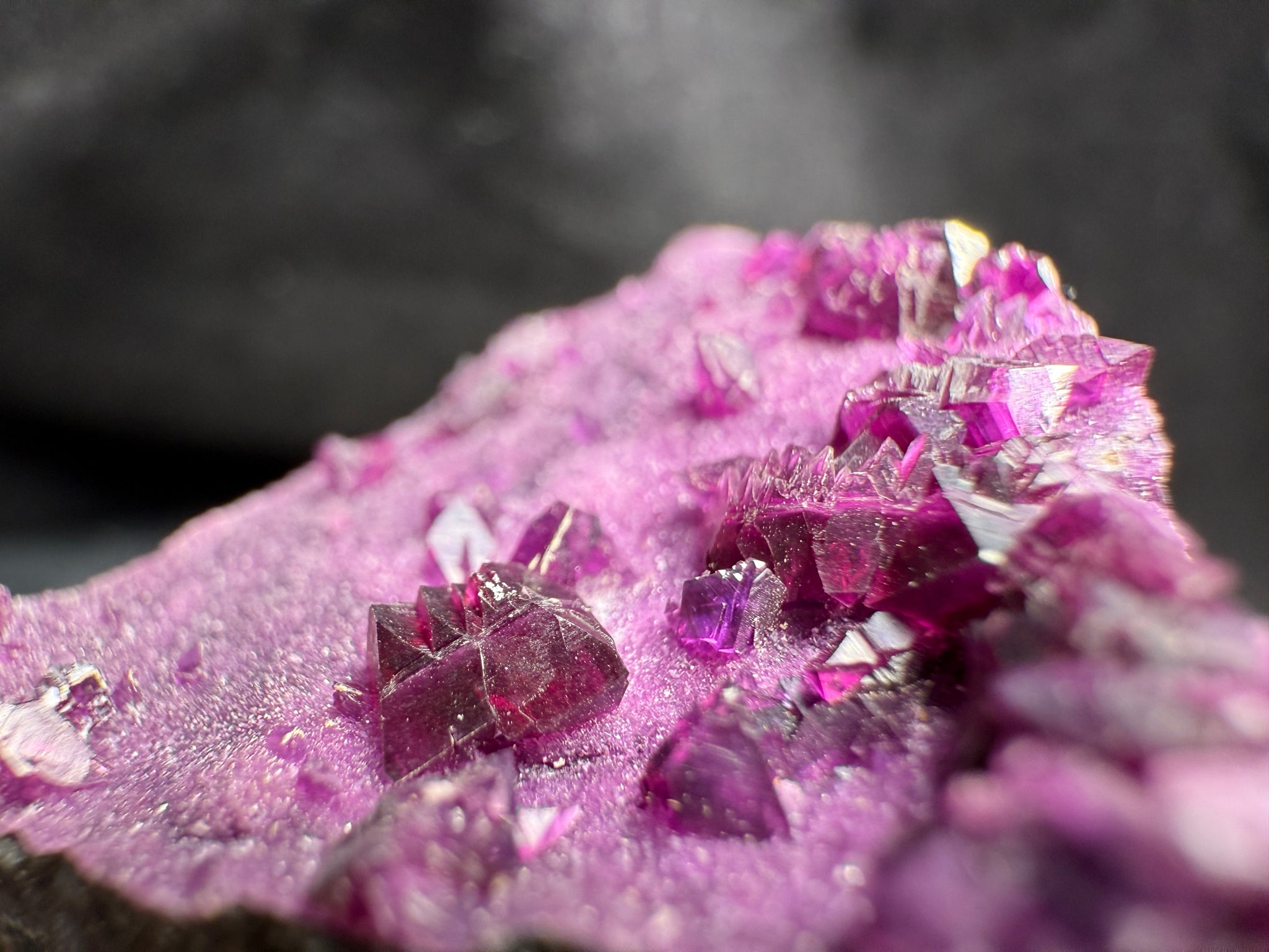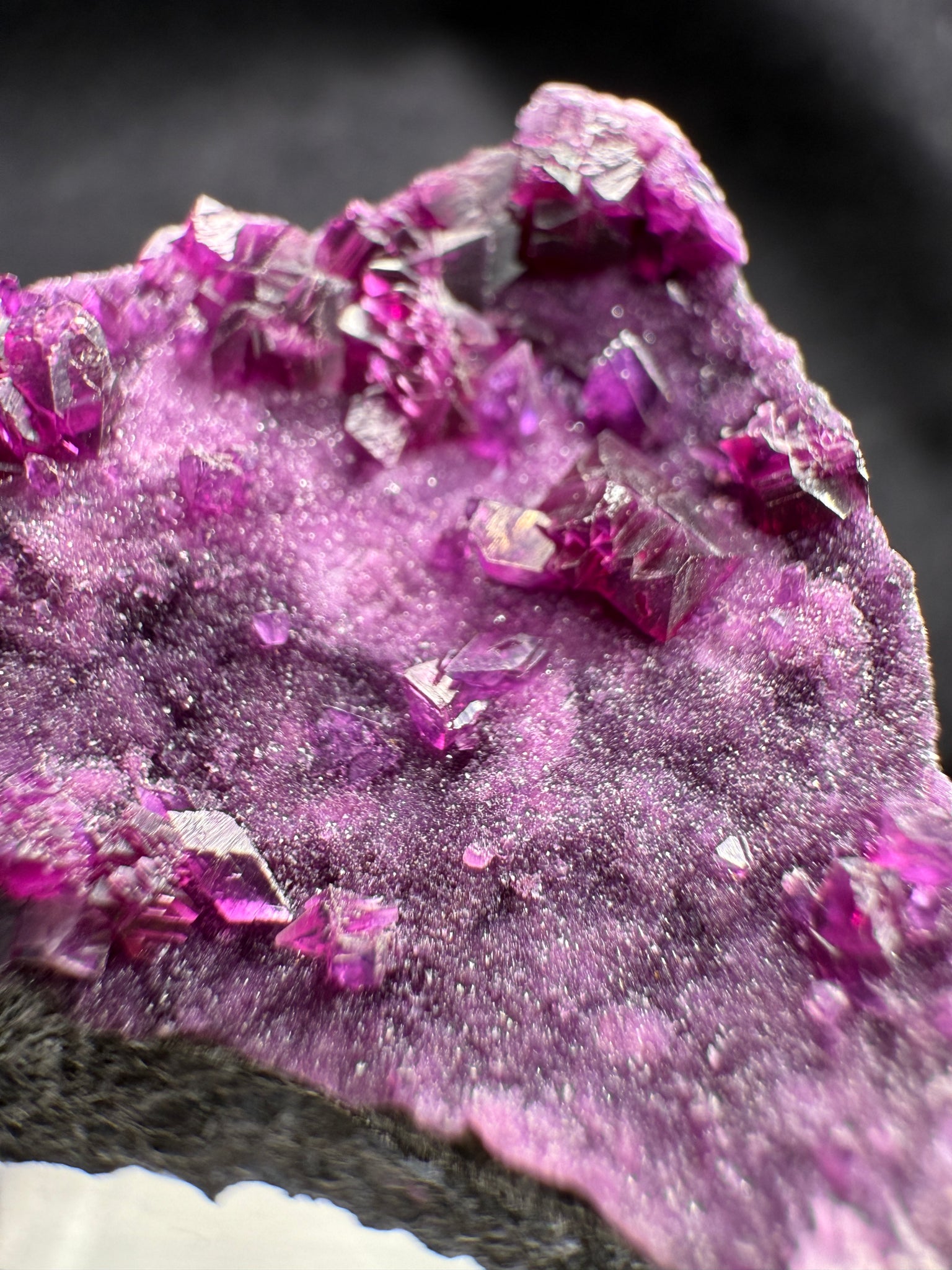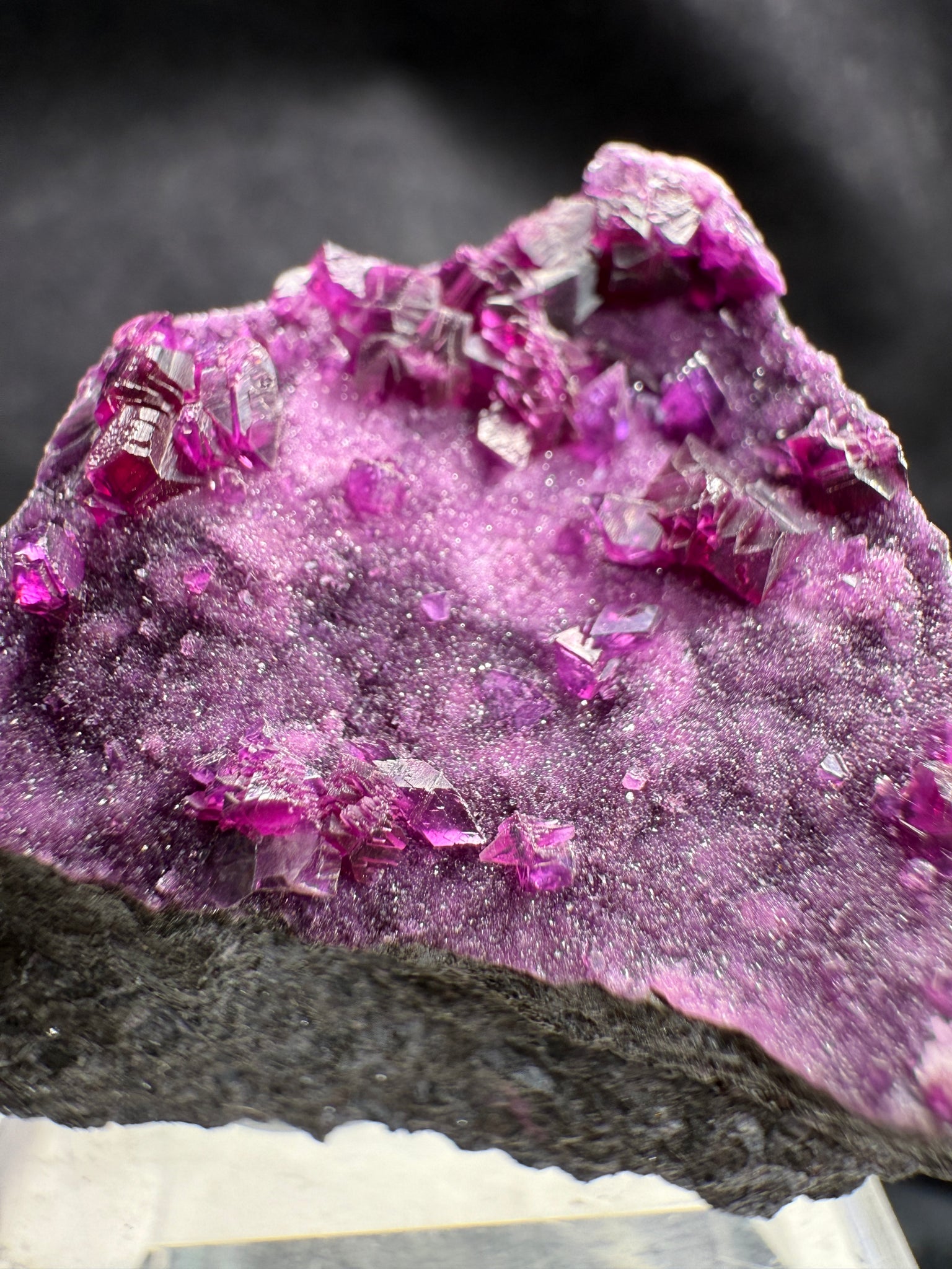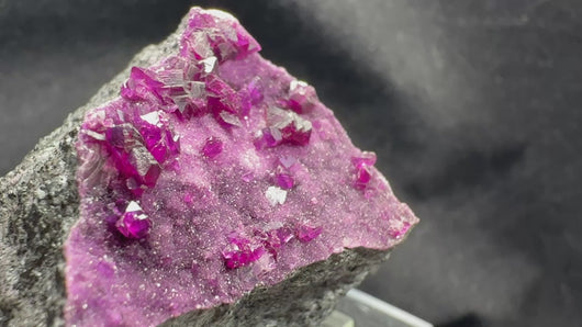 Vibrant magenta-purple crystals of Kammererite elegantly scattered across the matrix, creating a striking color contrast. This specimen, from the Kop Dağları Mountains in Turkey, showcases the vivid hue and fine crystal definition for which this locality is well known.