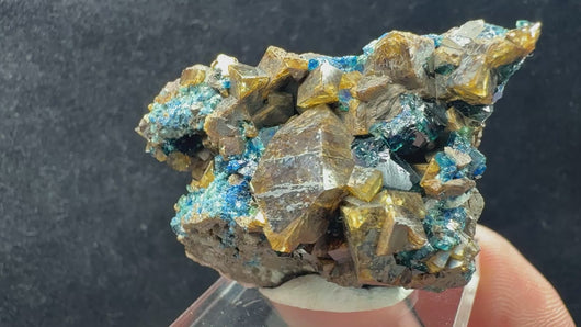 This superb specimen features a large, well-defined Siderite crystal accompanied by additional Siderite and deep blue Lazulite crystals. The contrast of golden-brown and vivid blue creates an eye-catching and classic example from the renowned Crosscut Creek locality, Rapid Creek, Yukon. 4.1 x 2.7 x 2.7 cm