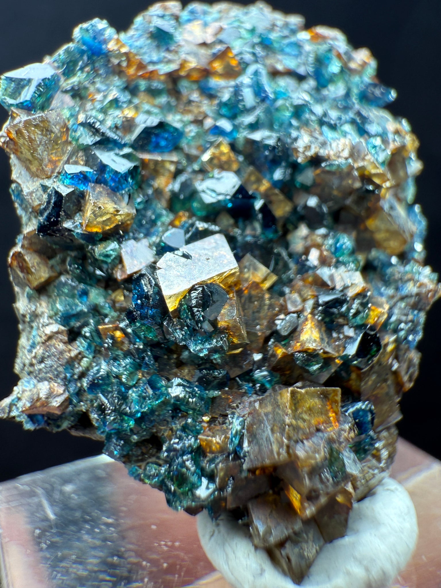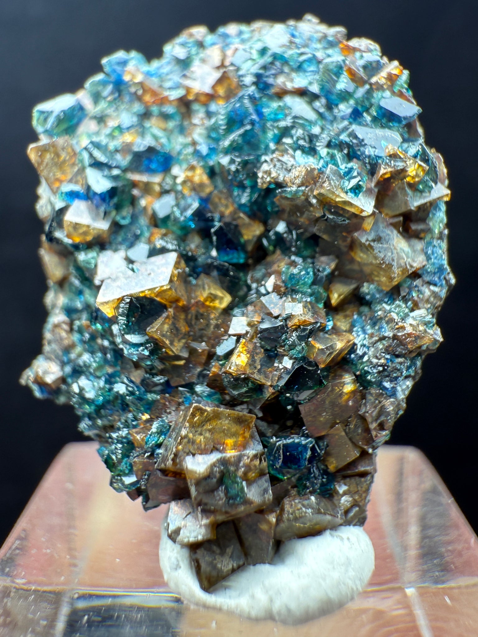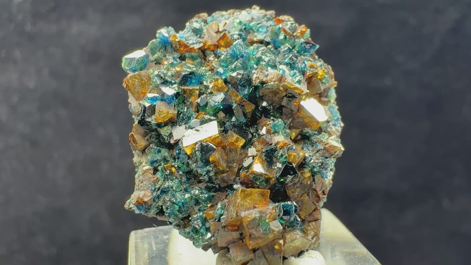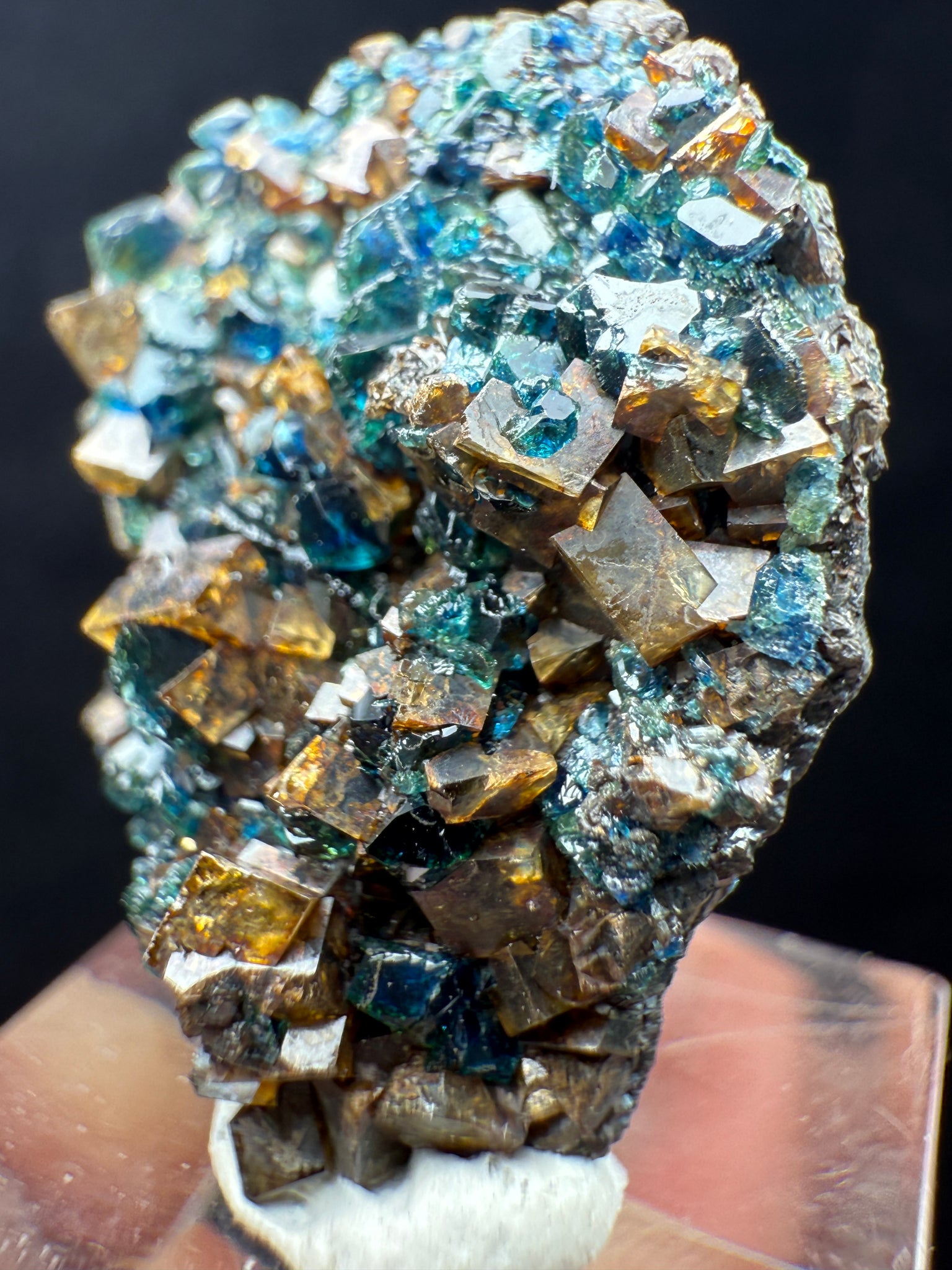 A striking combination of deep blue Lazulite and golden-brown Siderite crystals from Crosscut Creek, Yukon. The strong color contrast between the two minerals gives the piece excellent balance and aesthetics. 2.2 x 1.9 x 0.7 cm