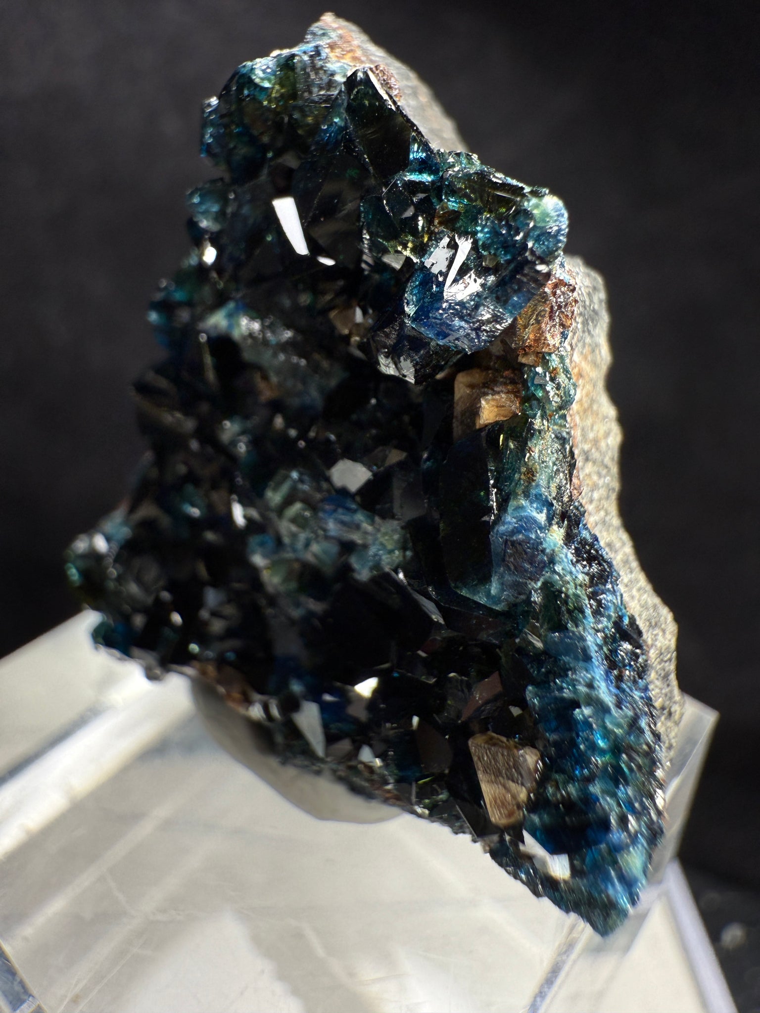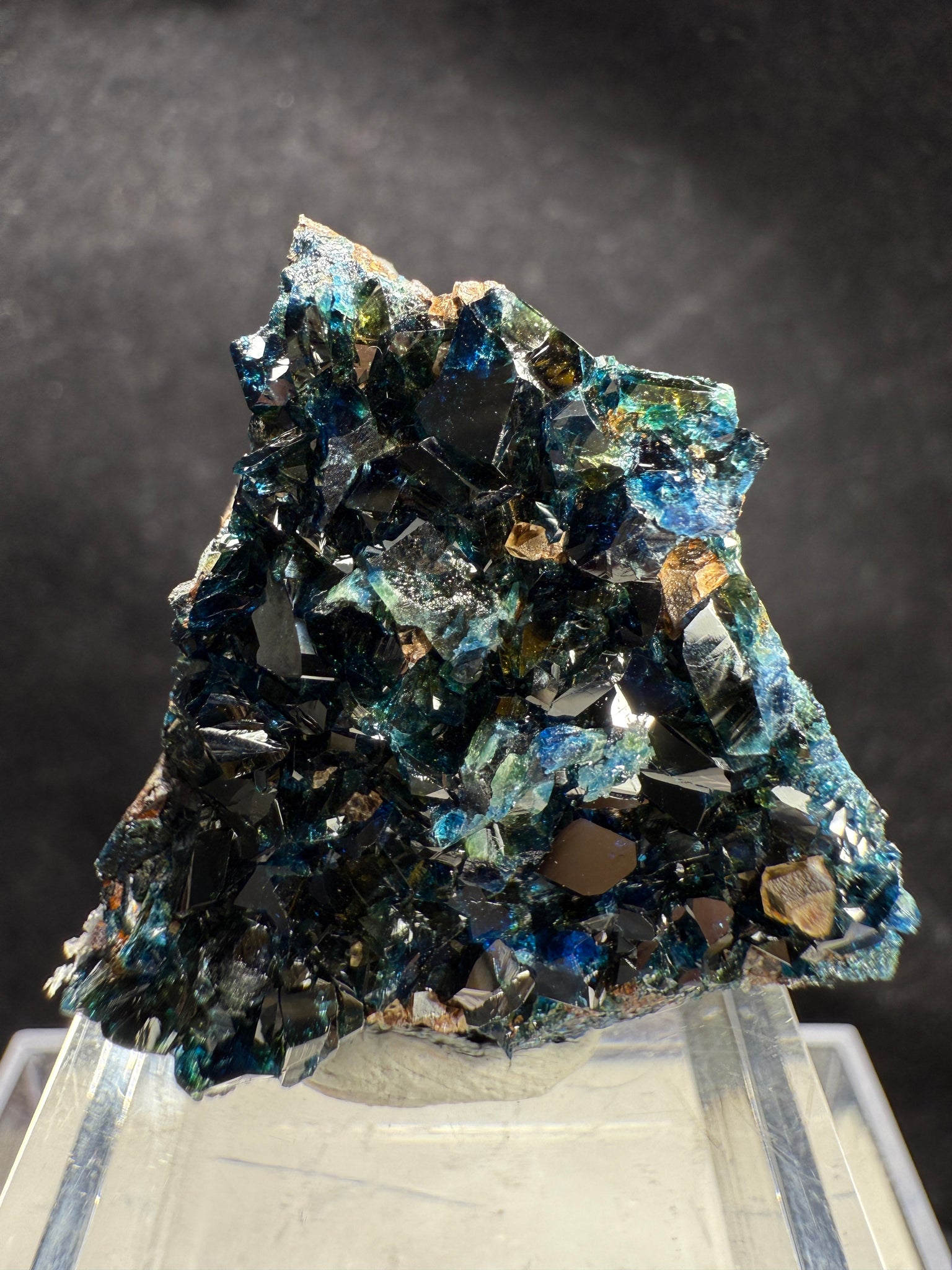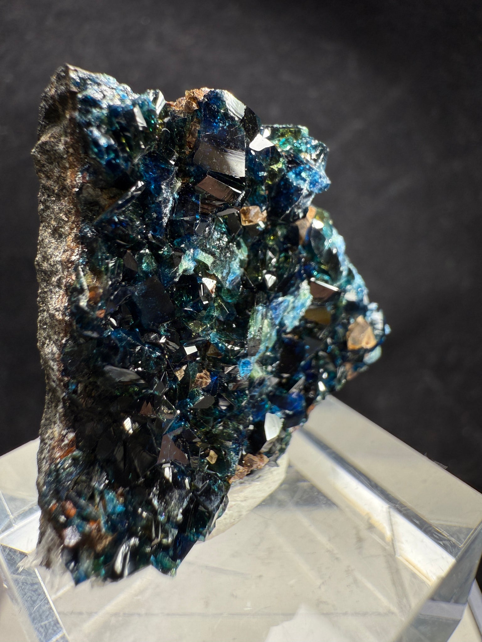 A splendid specimen featuring deep, lustrous blue Lazulite crystals alongside rich brown Siderite. Both minerals are well-formed, and the striking color contrast creates a highly aesthetic display piece. From Rapid Creek, Yukon, Canada.