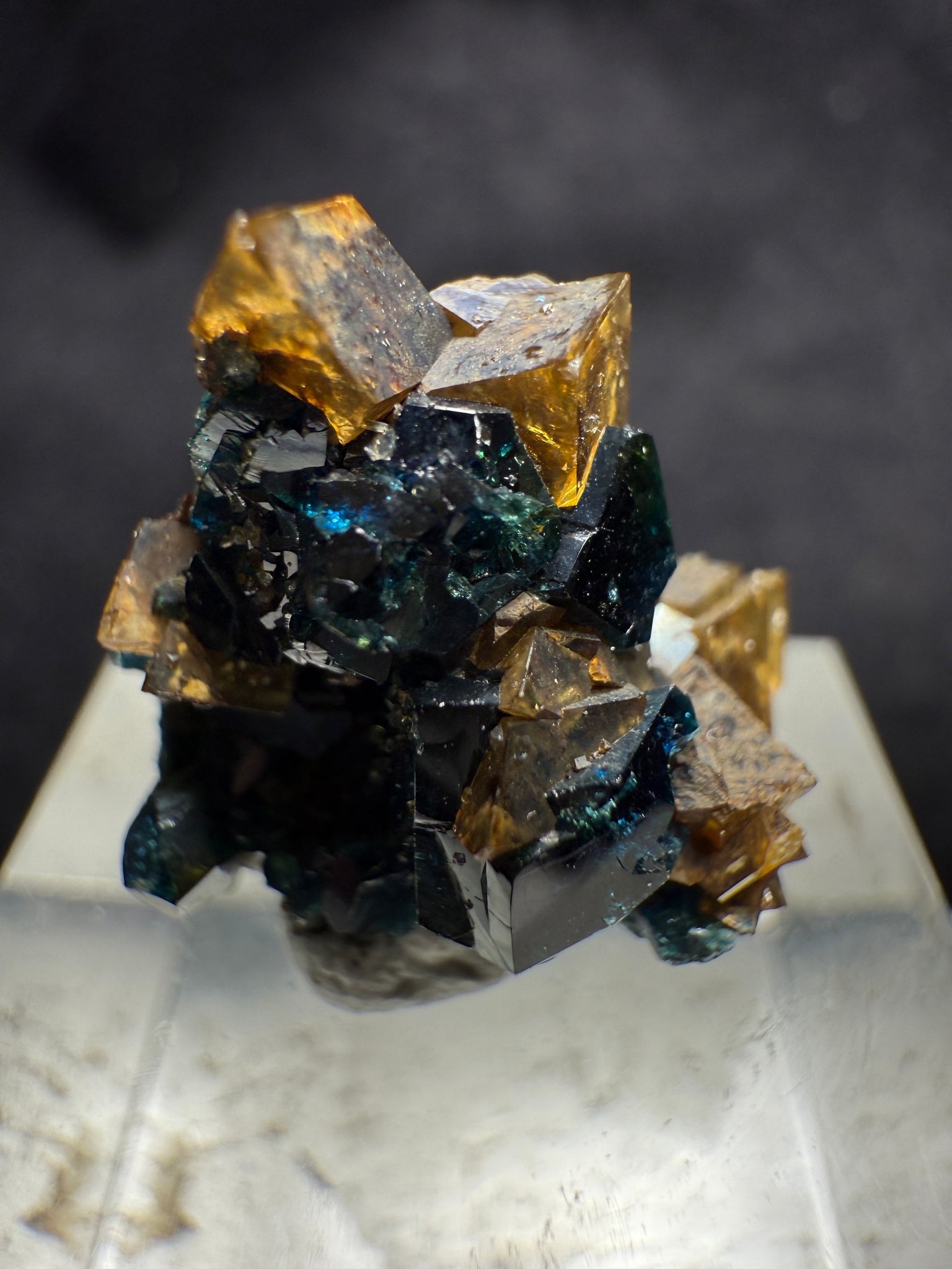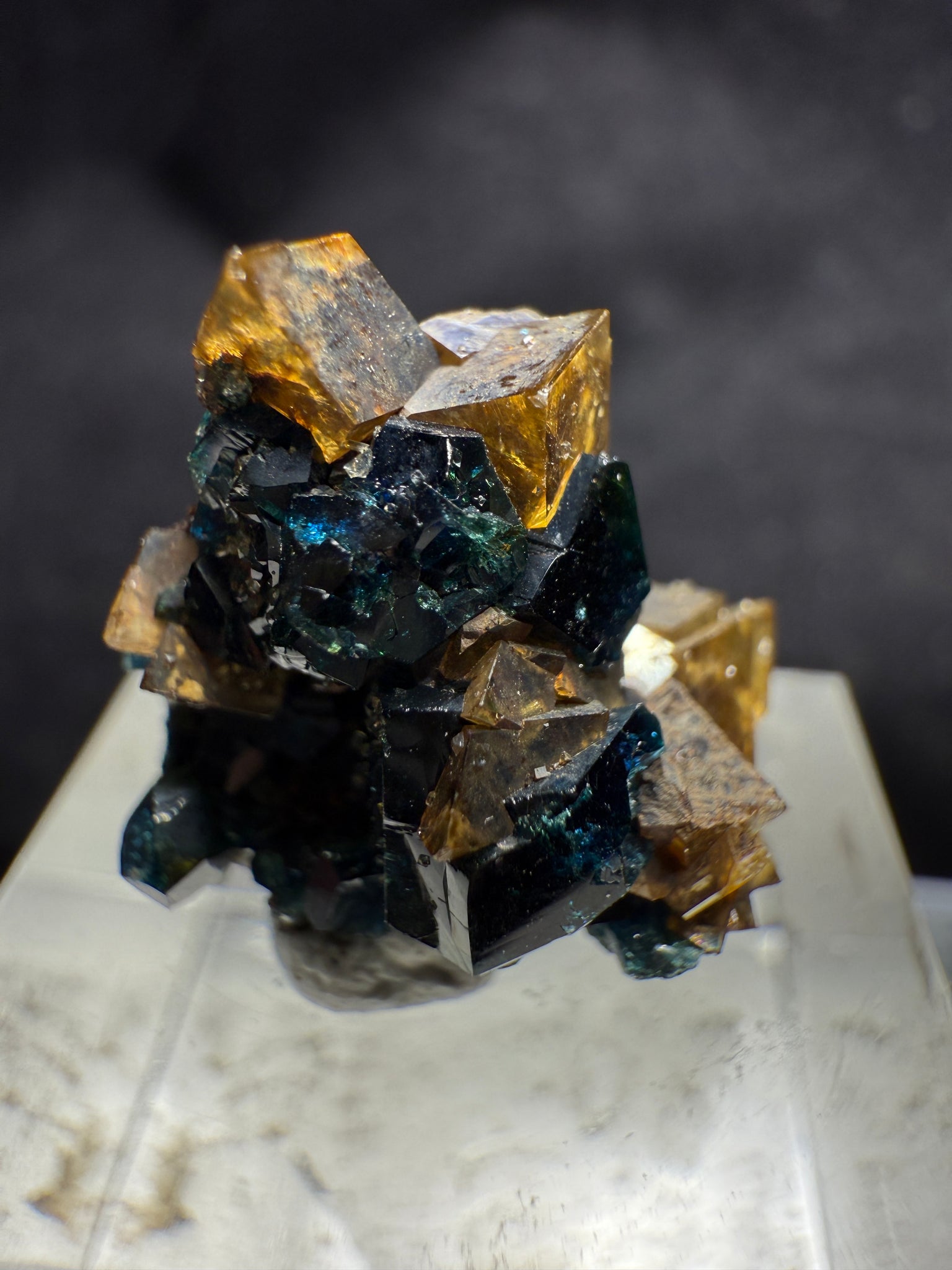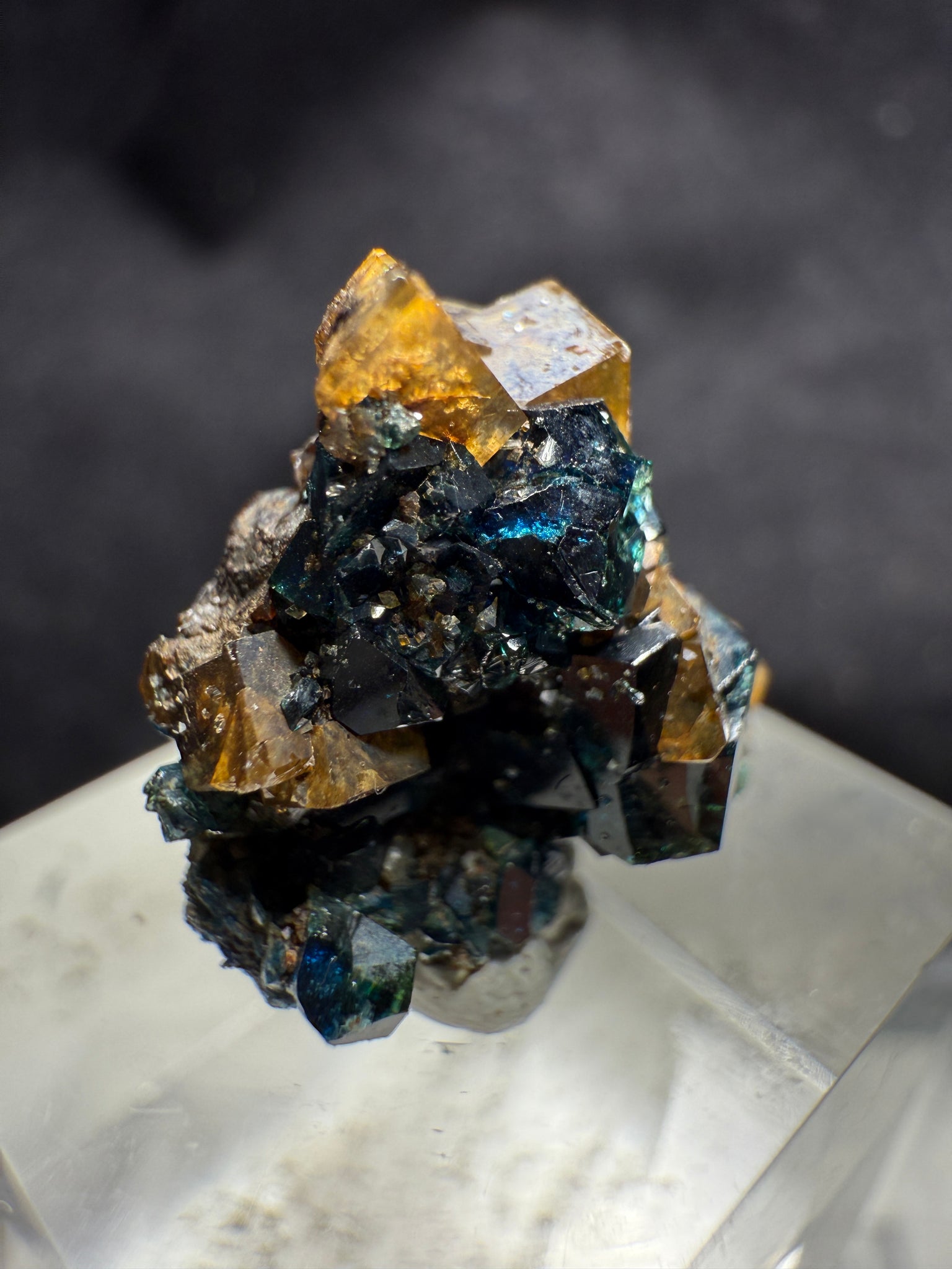 A striking composition of Lazulite and Siderite, showcasing superb color contrast and excellent crystal quality. The piece is equally beautiful from the back, revealing additional depth and balance in form and tone. 1.5 x 1.5 x 1.1 cm
