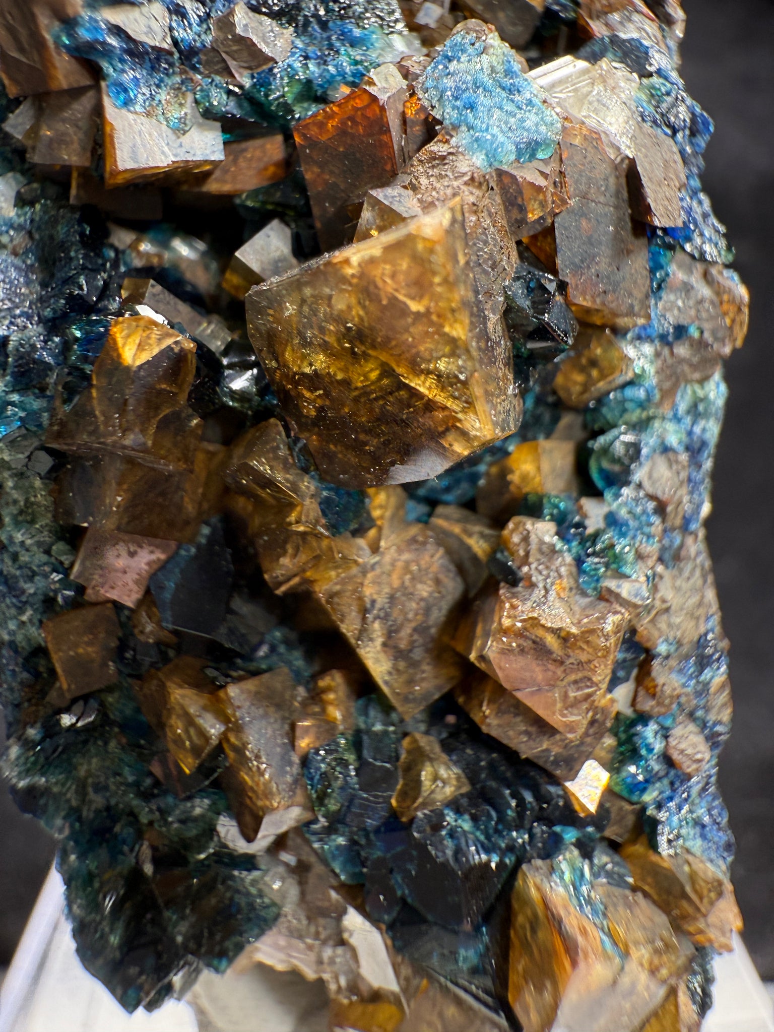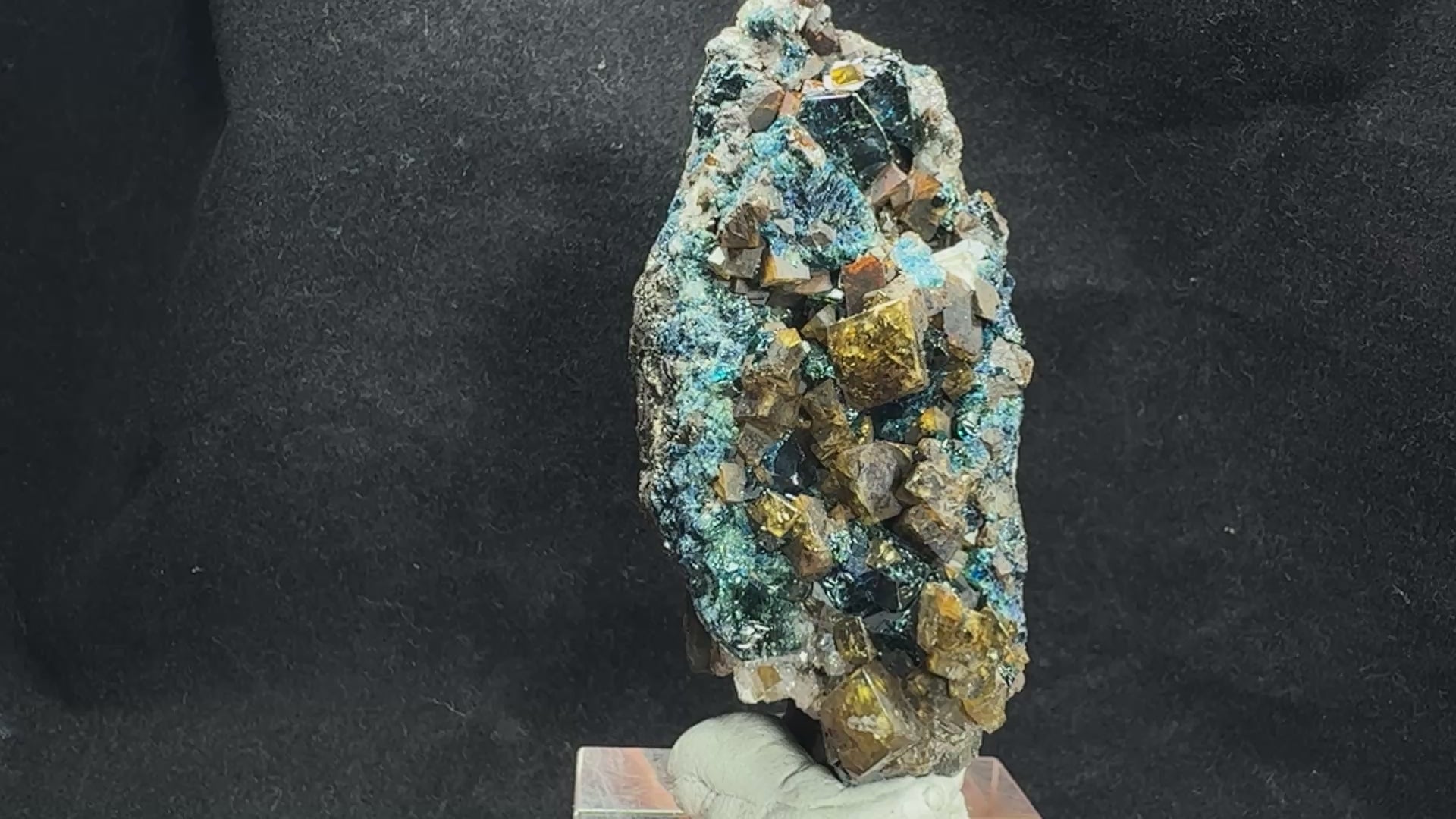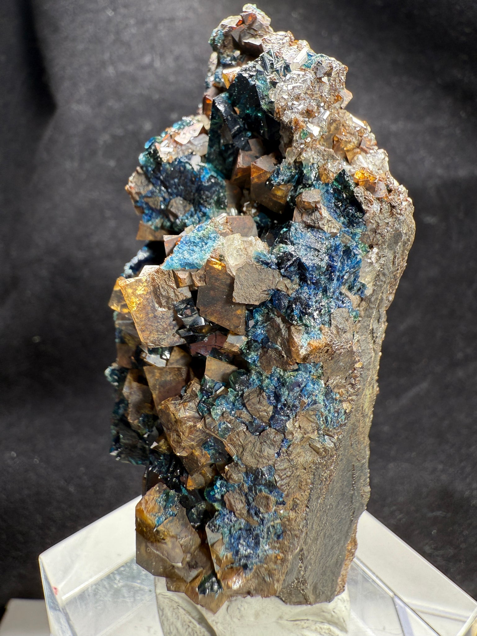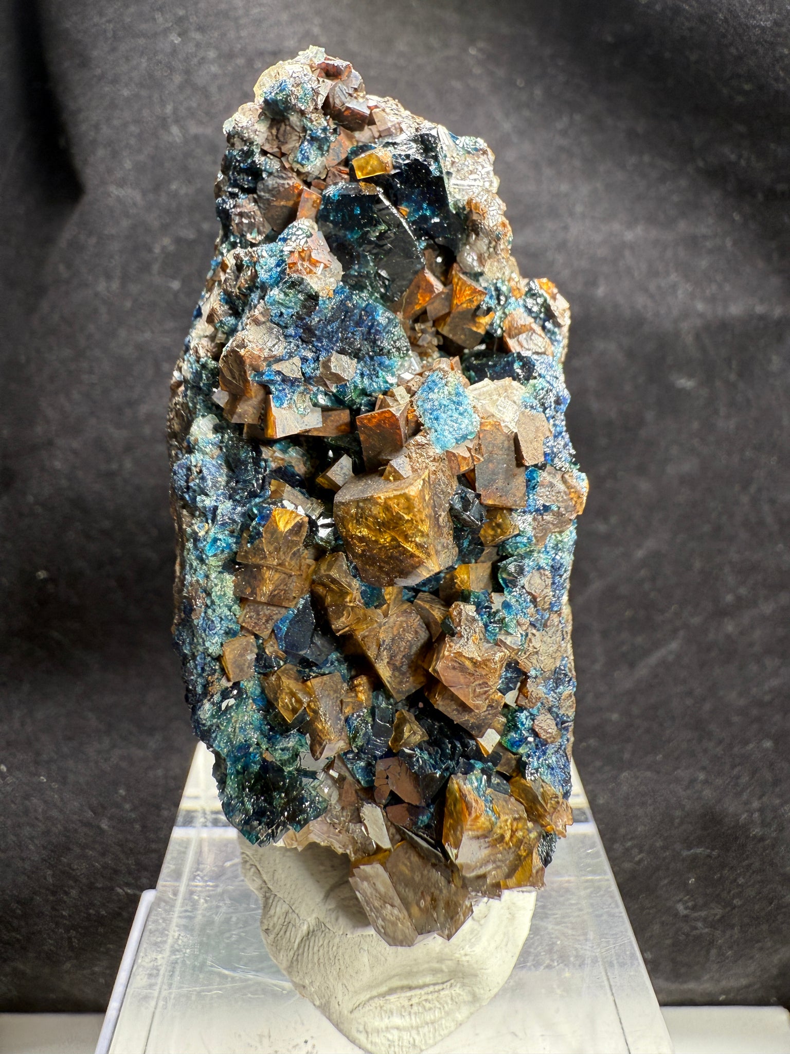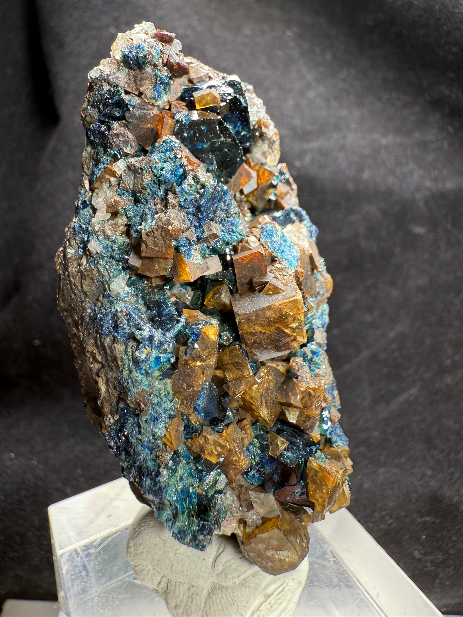 An exceptional specimen featuring unusually large Siderite crystals intergrown with deep blue Lazulite. Several Fluorapatite crystals are present on both ends, completing this superb combination. The contrast between the golden-brown Siderite and the rich blue Lazulite makes this a distinctive and well-balanced piece from the classic Cross Cut Creek locality, Yukon, Canada. 7.4 x 3.2 x 2.7 cm