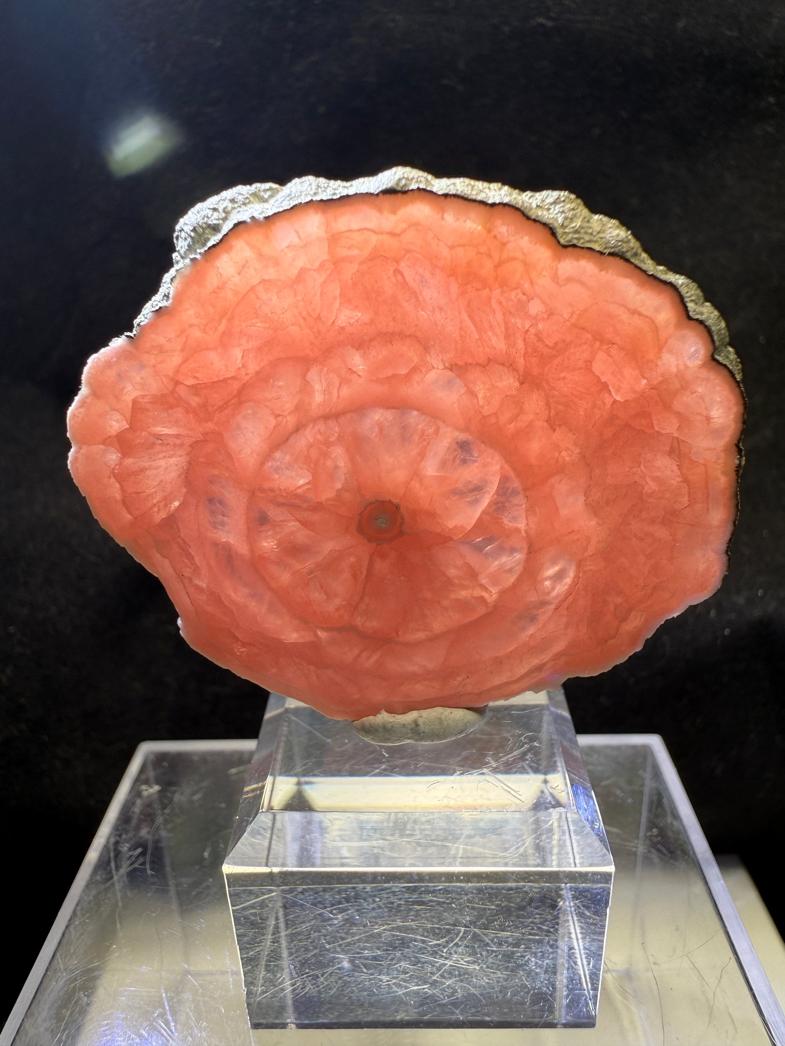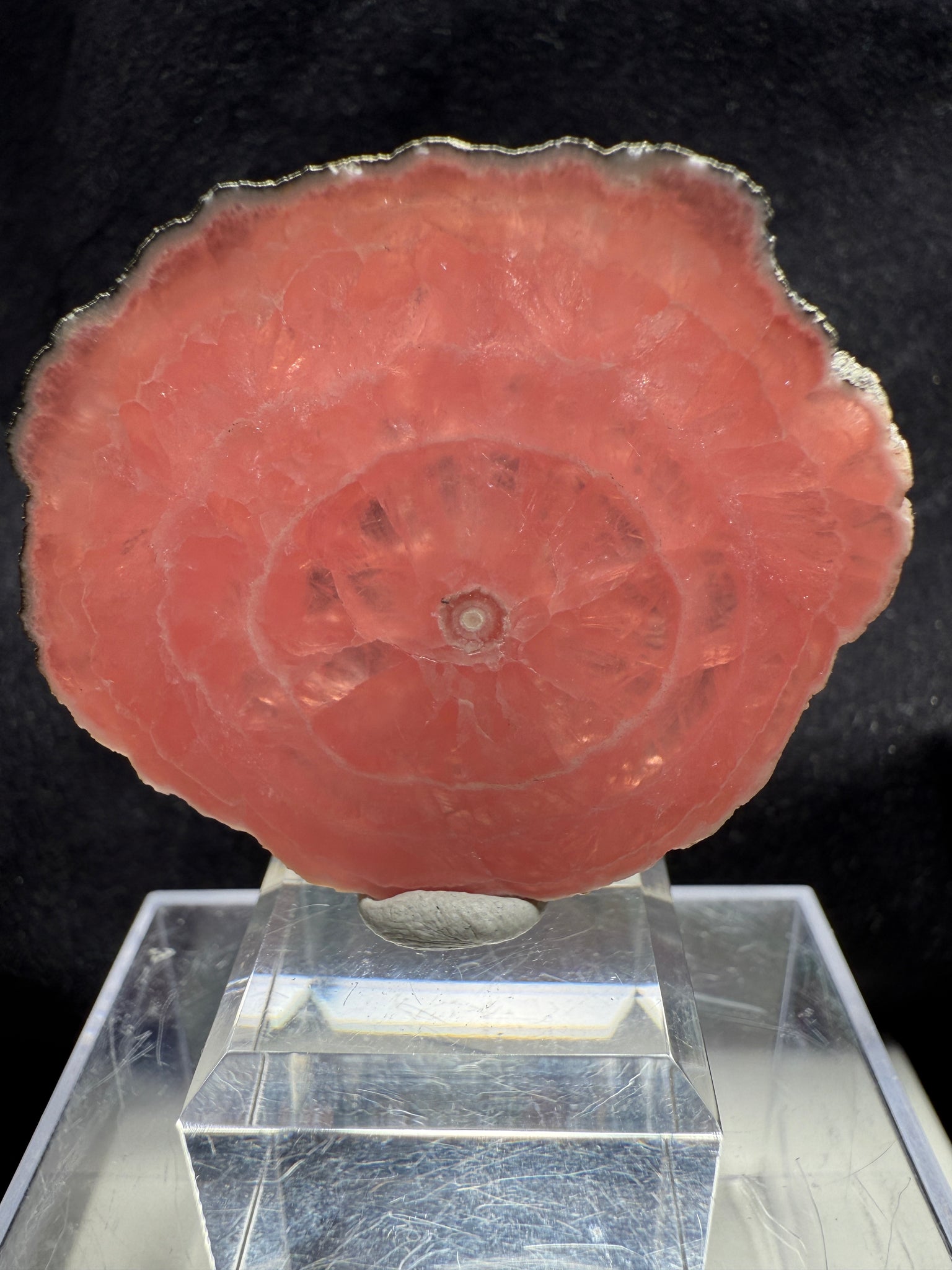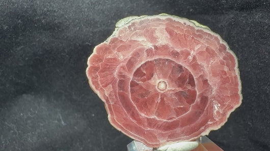 A superb polished slice of Rhodochrosite exhibiting a rich, saturated reddish-pink color with striking concentric growth bands reminiscent of a tree trunk. The contrast and symmetry of the striations are exceptional, making this a truly classic and aesthetic example from the famous Capillitas Mine, Catamarca, Argentina. 4.4 x 3.7 x 0.4 cm
