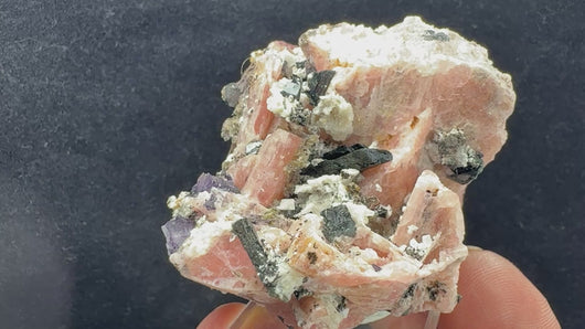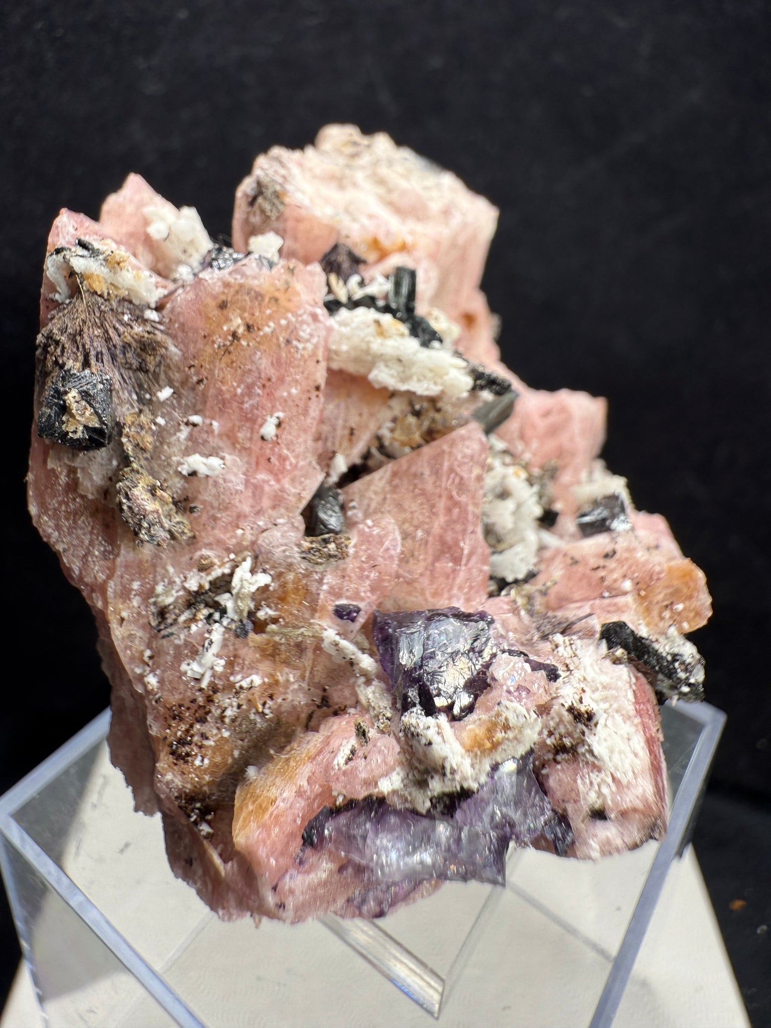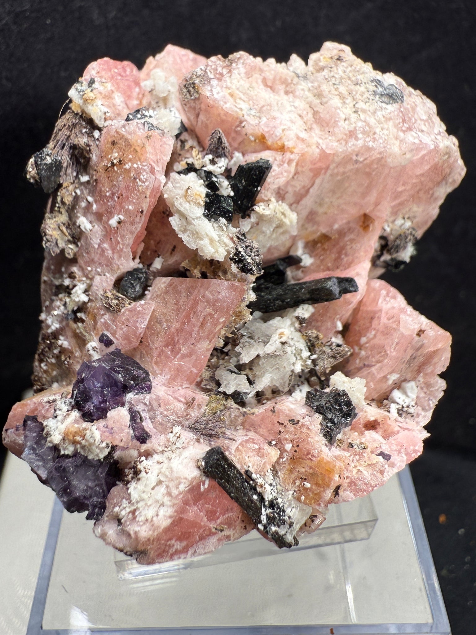 A less common and highly attractive association featuring purple Fluorite with a well-defined Serandite crystal, accompanied by white Albite and black Aegirine. The strong color contrast and sharp crystal forms make this a striking and classic example from the famous Mont Saint-Hilaire locality. 4.8 x 4.5 x 4.3 cm