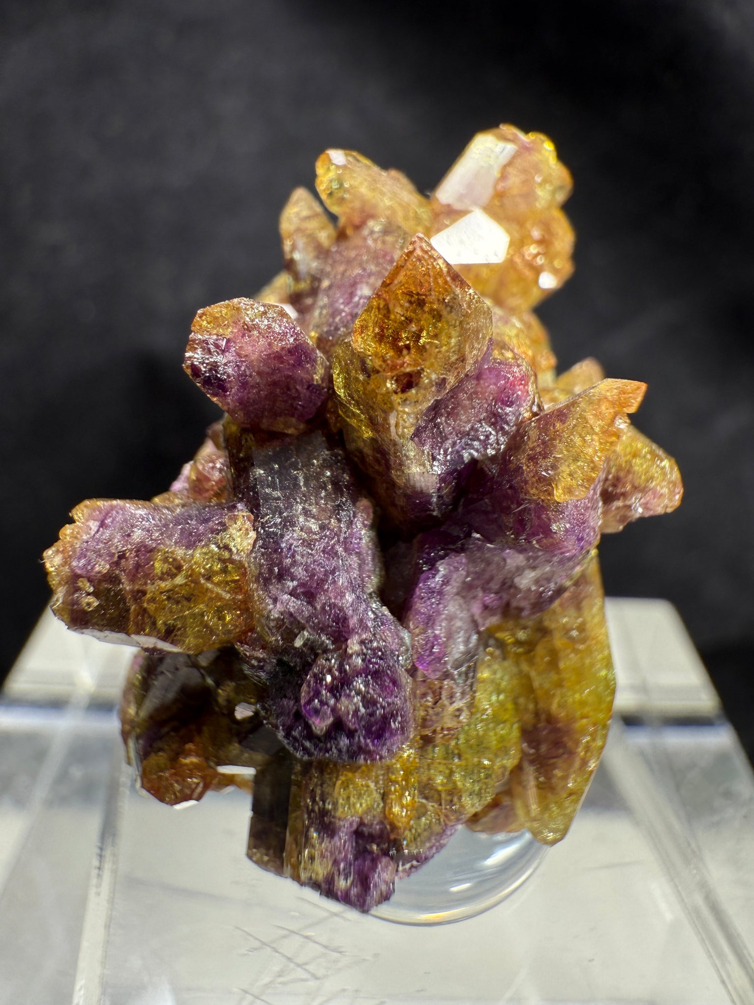 A beautiful cluster of Vesuvianite crystals showing an uncommon mix of purple and green tones with soft pink tints. The piece features multiple well-formed crystals and stands out for its rare color combination, quite different from the typical green seen from this classic locale. 2.8 × 2.2 × 1.7 cm.