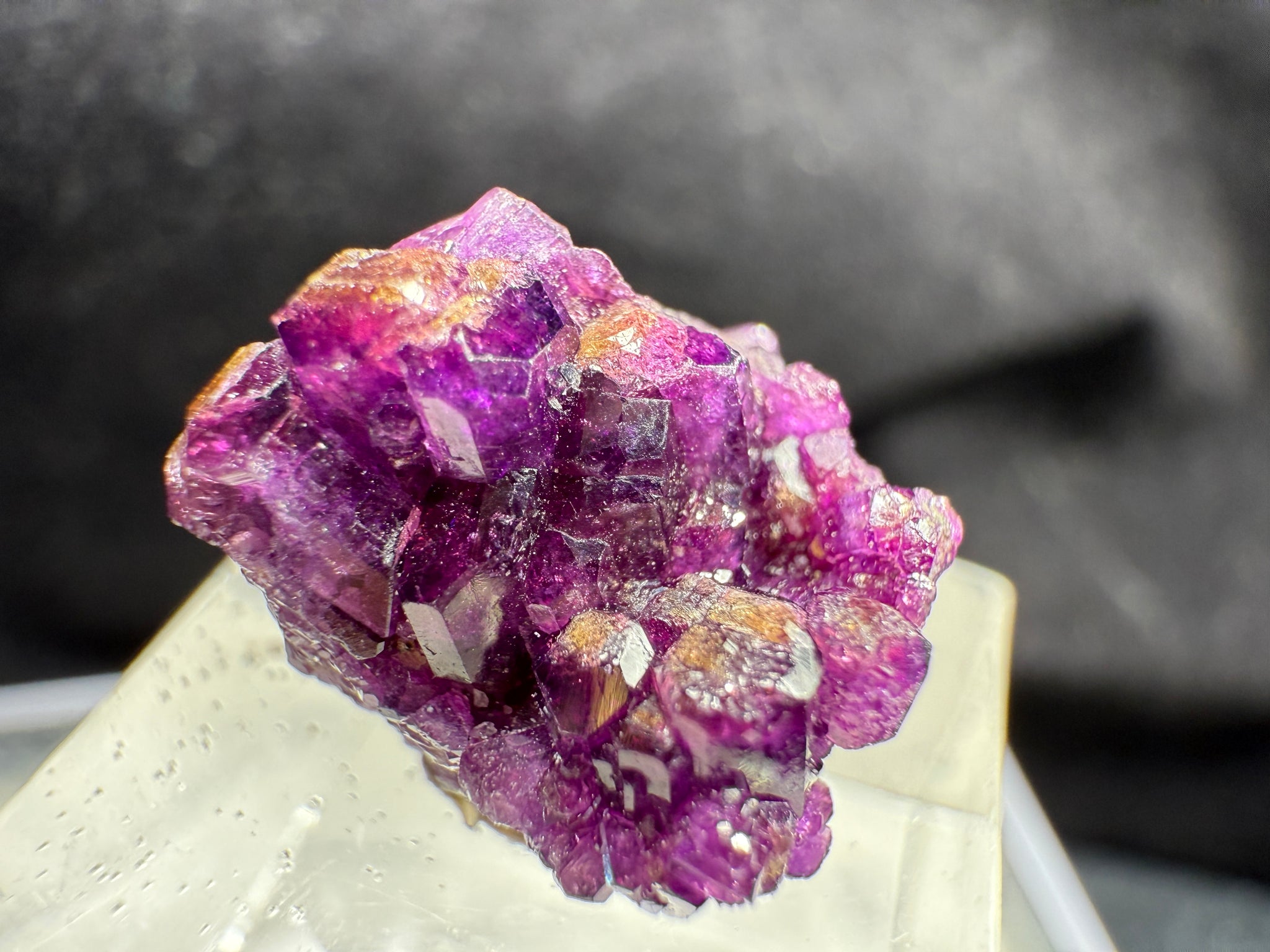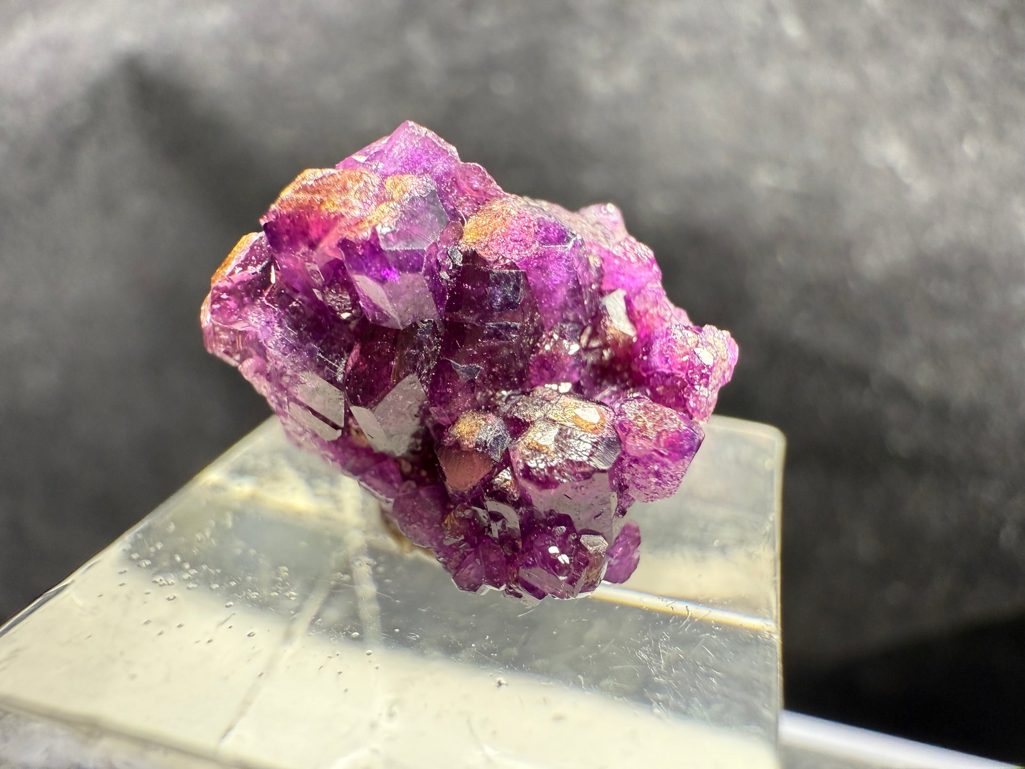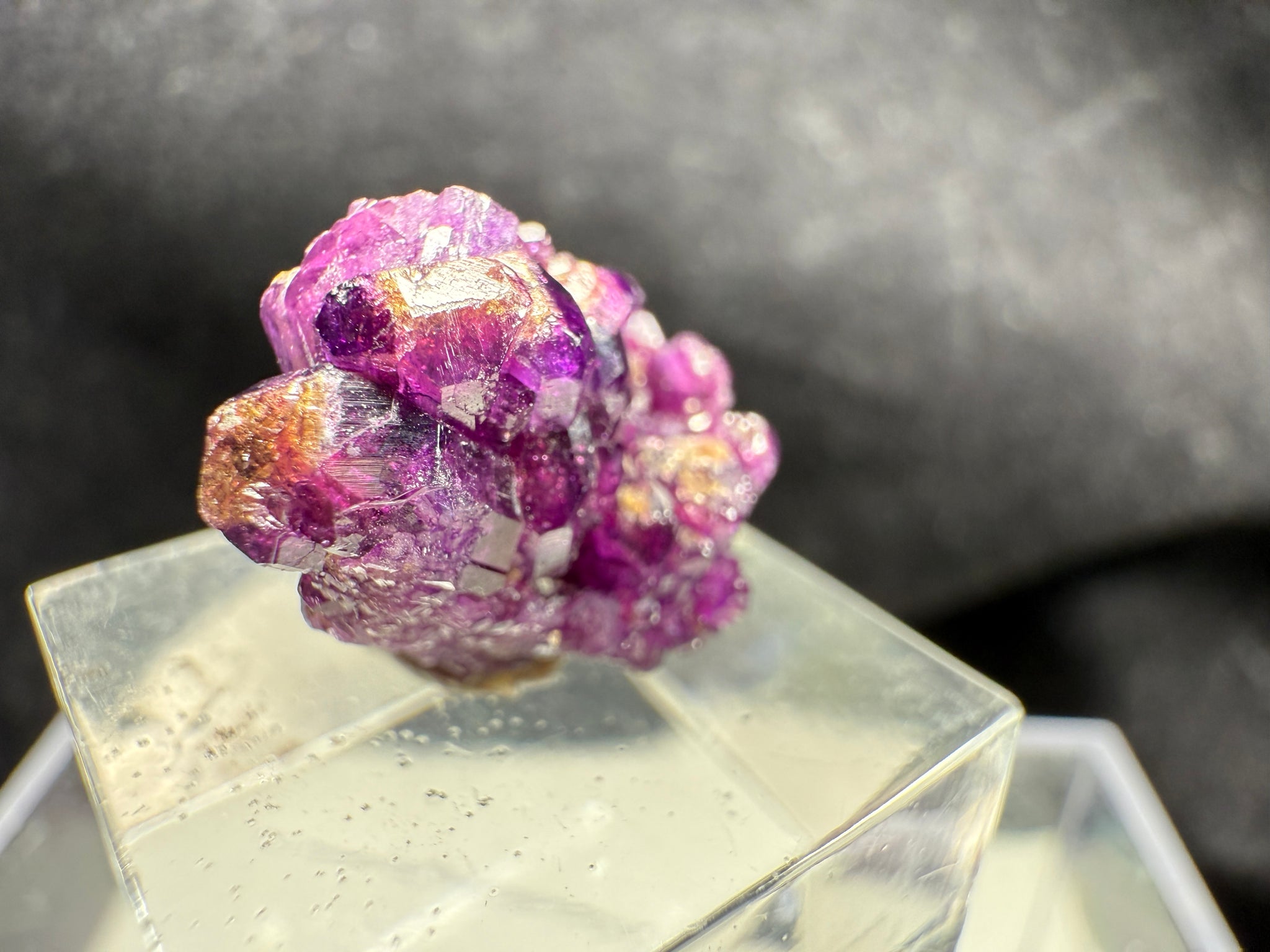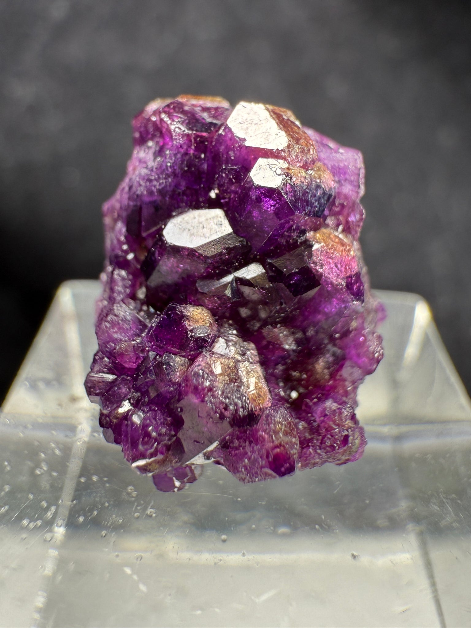 Rich magenta-purple Vesuvianite crystals with a bright, glassy luster. Though small, this is an excellent quality specimen from the Jeffrey Mine, showing vibrant color and sharp crystal form typical of the best pieces from this classic Canadian locality. 1.5 x 1.1 x 1.0 cm