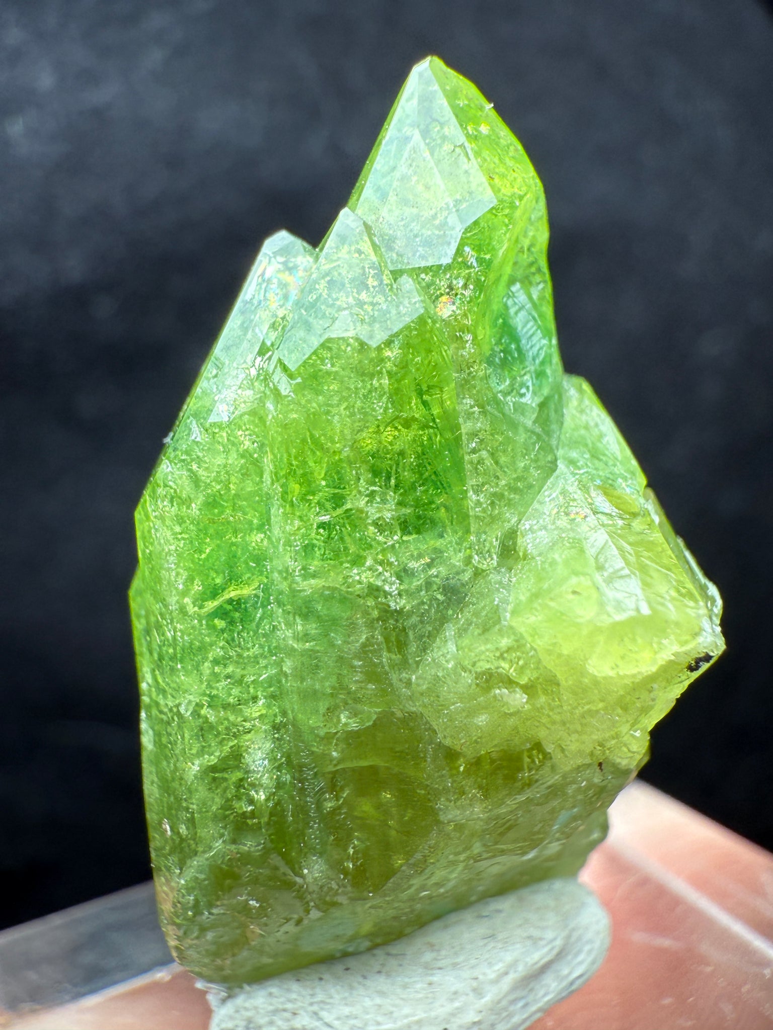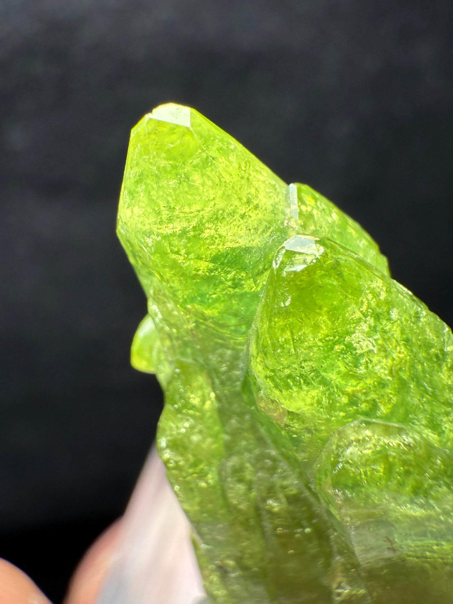 A striking specimen featuring a trio of well-formed, terminated chrome-green Vesuvianite crystals, beautifully accented by vivid green Diopside. This fine piece showcases excellent crystal form and lustrous surfaces, making it a standout example from the renowned Jeffrey Mine. Dimensions: 2.9 x 1.5 x 1.4 cm.
