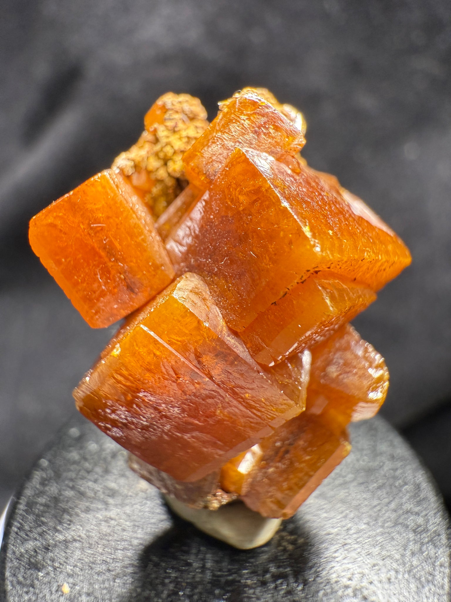 A striking cluster of thick, lustrous Wulfenite crystals exhibiting a warm caramel to orange-brown hue, typical of the classic Los Lamentos locality. The crystals are broad and well-developed, with good translucency and rich color saturation. A classic and desirable piece from one of Mexico’s most famous Wulfenite-producing districts. 2.6 x 1.7 x 1.3 cm