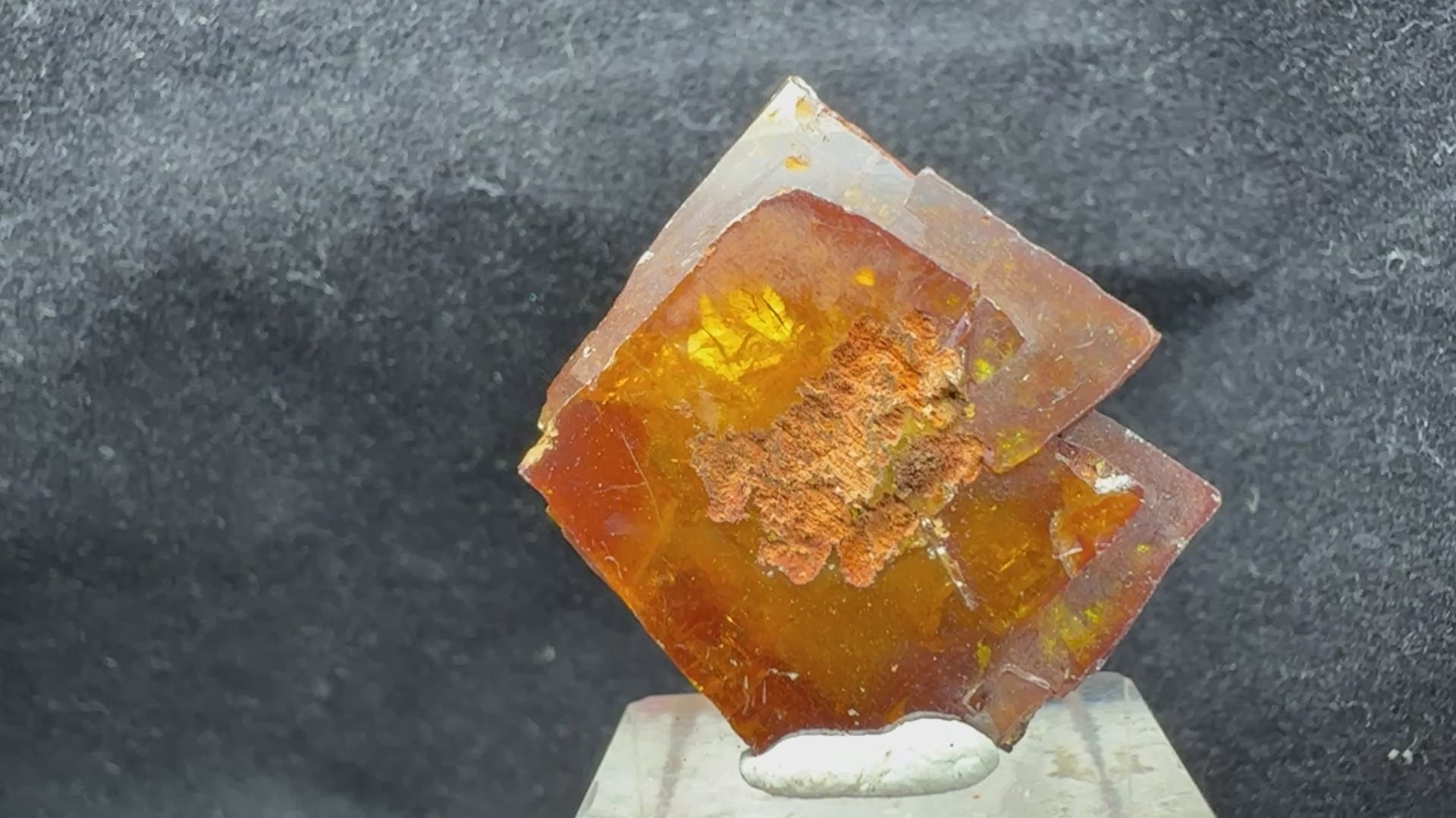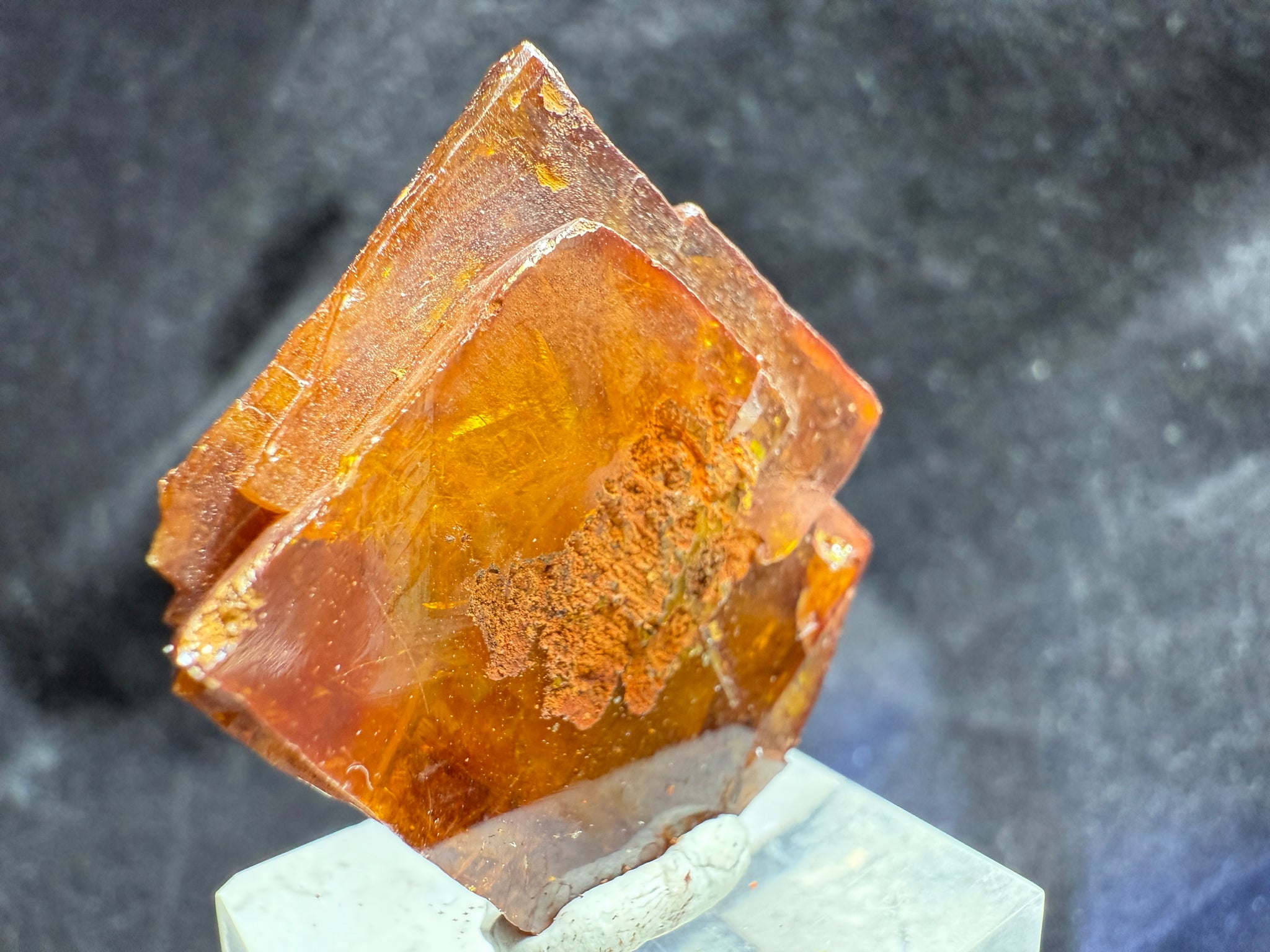 A well-terminated Wulfenite crystal showing bright luster on one side and a more opaque, satin-like finish on the other. The color and form are characteristic of fine Mexican material, with sharp edges and pleasing contrast between the translucent and matte surfaces. A neat, balanced crystal with classic appeal. 2.4 x 2.3 x 0.5 cm